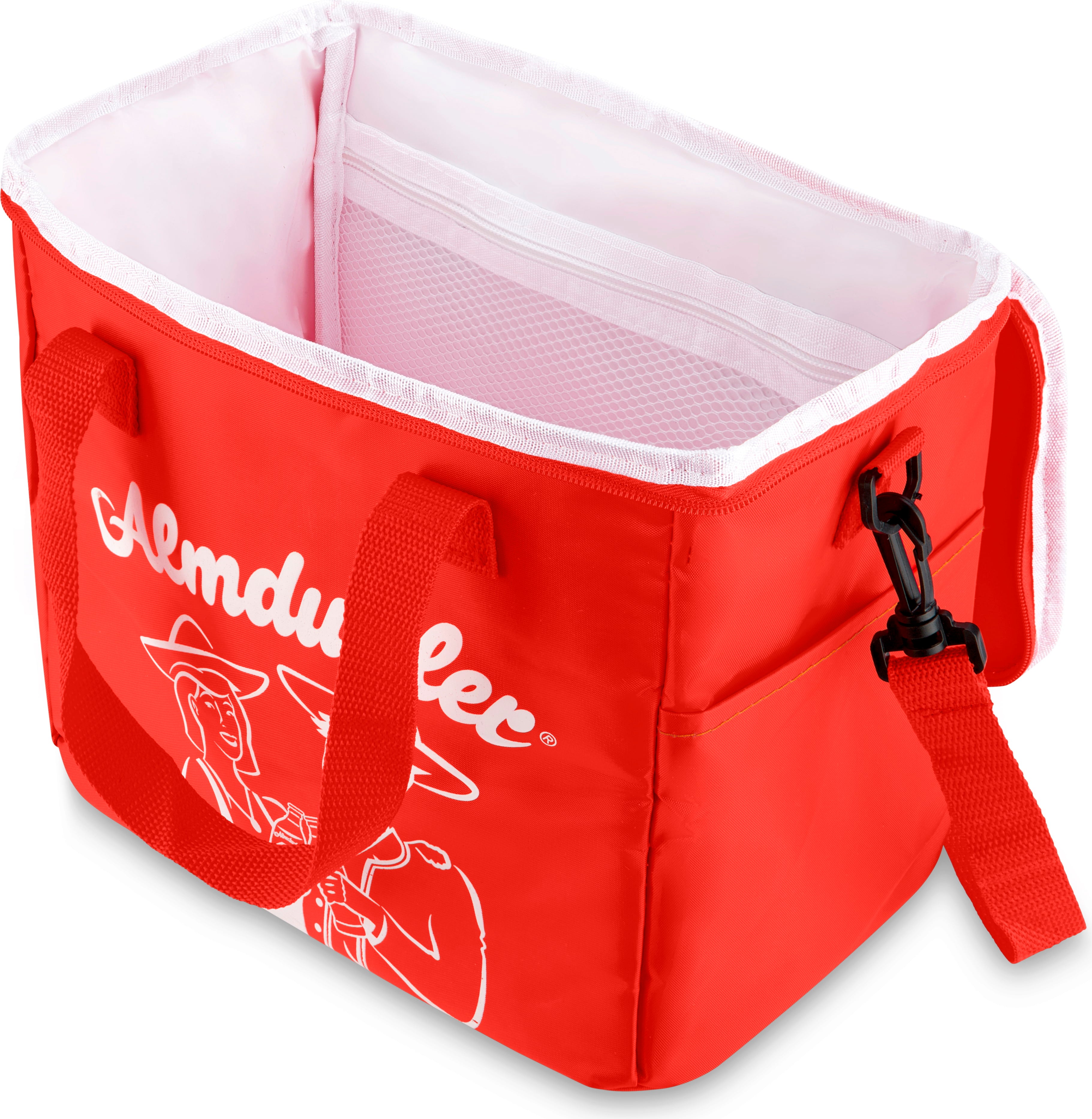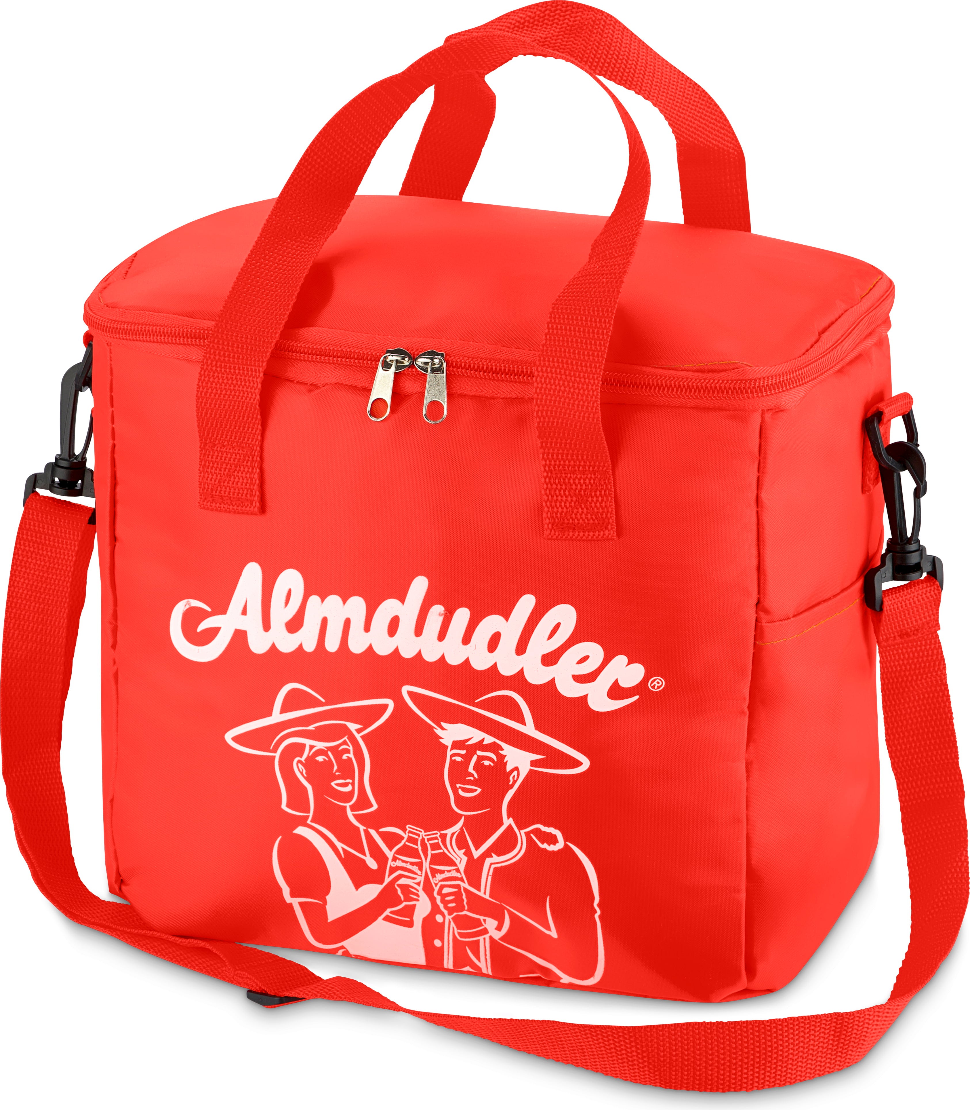 De rode koeltas van Almdudler met het iconische Almdudler kostuumpaar motief en Almdudler belettering zorgt voor verkoeling op warme zomerdagen. Dankzij de praktische schouderband en handgreep is de kunststof koeltas zeer gemakkelijk te hanteren en biedt hij ruimte voor 6 flessen van 0,5 liter Almdudler. De Almdudler koeltas met een afmeting van 24 x 17 x 27 cm is perfect voor mooie dagen aan het meer.