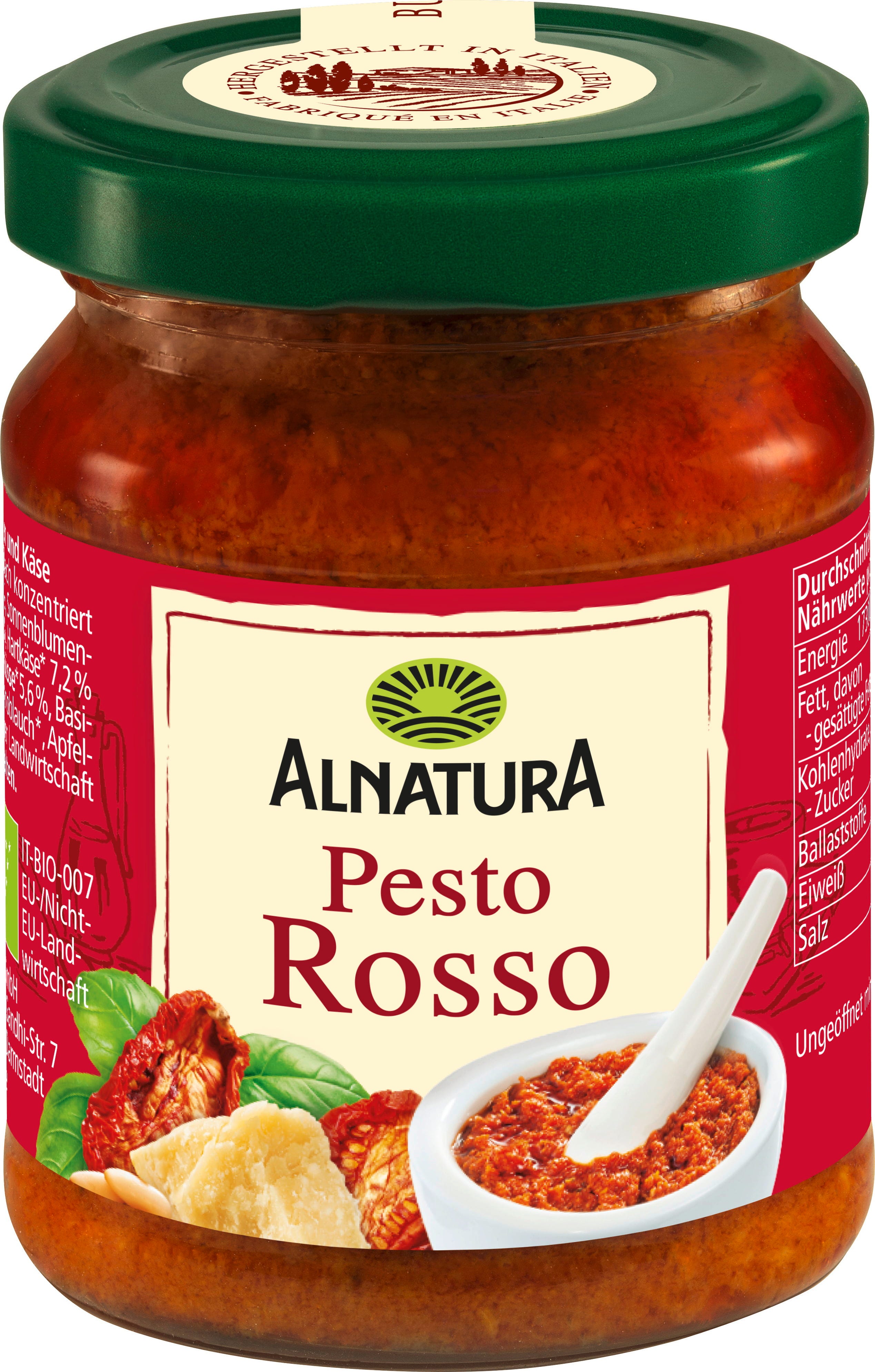 33 % Tomatenpuree tweemaal geconcentreerd, 17 % olijfolie extra vierge[1], 17 % zonnebloemolie[1], 13 % gedroogde tomaten[1] (gedroogde tomaten, water, Meersalz), 5,7 % cashewnoten[1], 5,5 % Pecorino[1], 3,8 % Basilicum[1], 3,4 % pijnboompitten[1], appelciderazijn[1], knoflook[1], Meersalz
