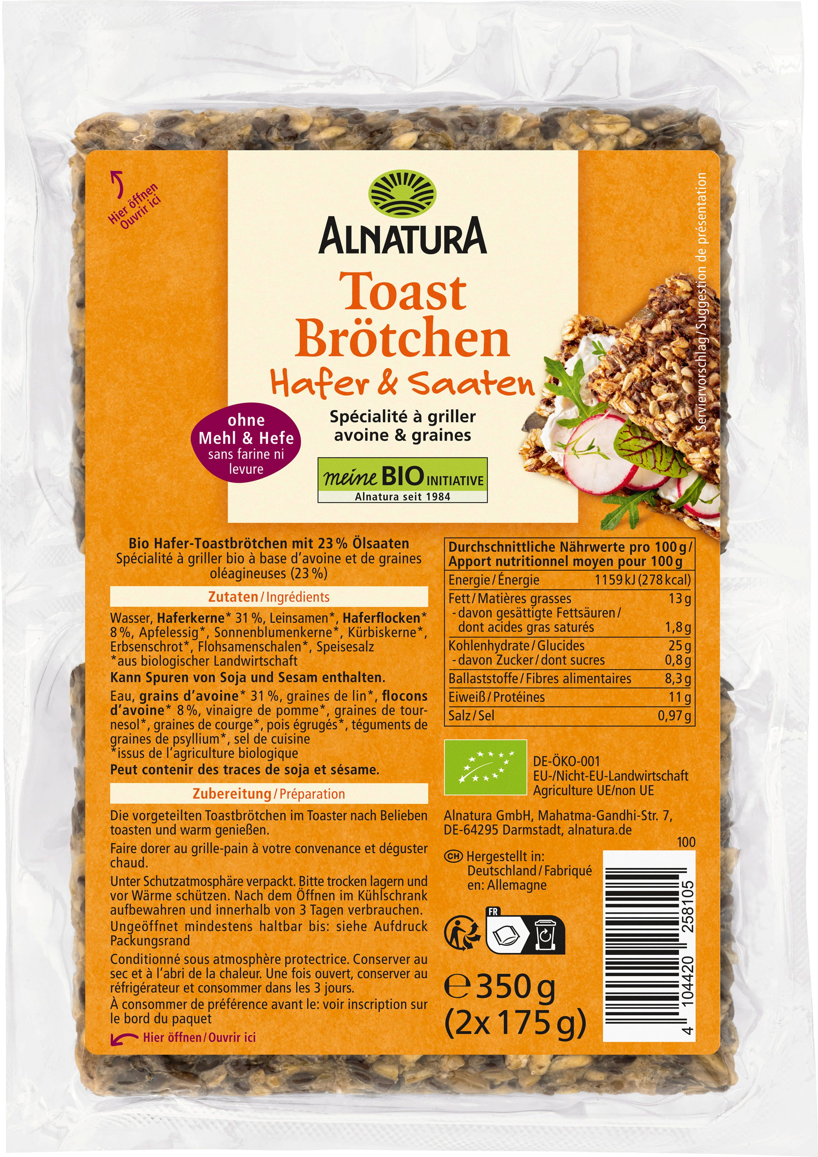 Het Alnatura Bio toastbroodje haver & zaden zorgt voor stevig knapperige genietmomenten. De basis bestaat uit haverkorrels en -vlokken en 23% oliehoudende zaden. Meel en gist zijn niet toegevoegd. Biologische kwaliteit die snel klaar is: gewoon even kort in de toaster opwarmen en zowel zoet als hartig te beleggen. Eén verpakking bevat 4 voorgesneden stuks.