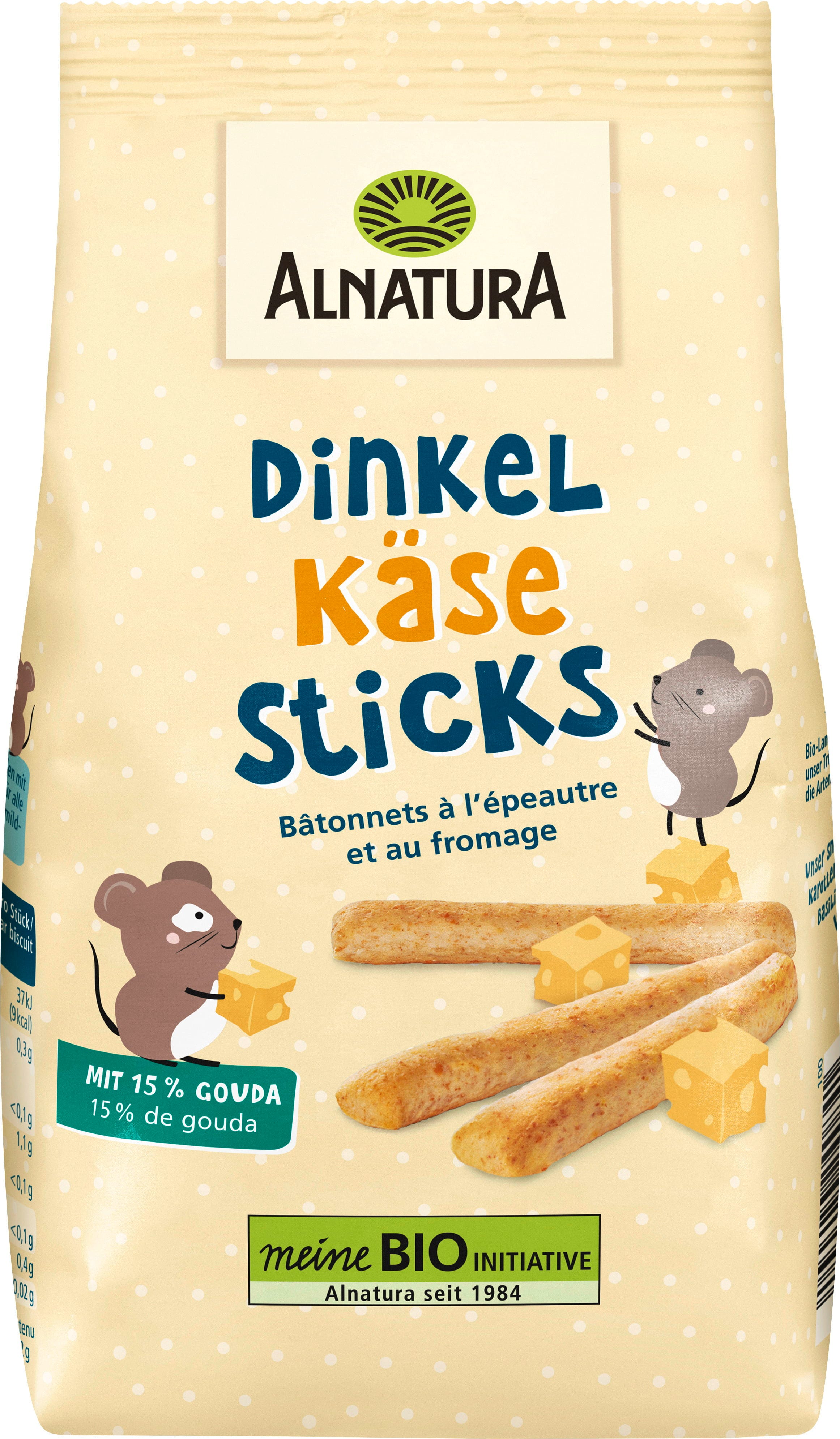 De Alnatura biologische speltkaassticks zijn een geweldige afwisseling voor de broodtrommel op de crèche of school. Deze hartige knabbels hebben een mild-kruidige smaak en zijn verfijnd met 15% gouda. Ze zijn ideaal als tussendoortje of voor onderweg tijdens een gezinsuitje.