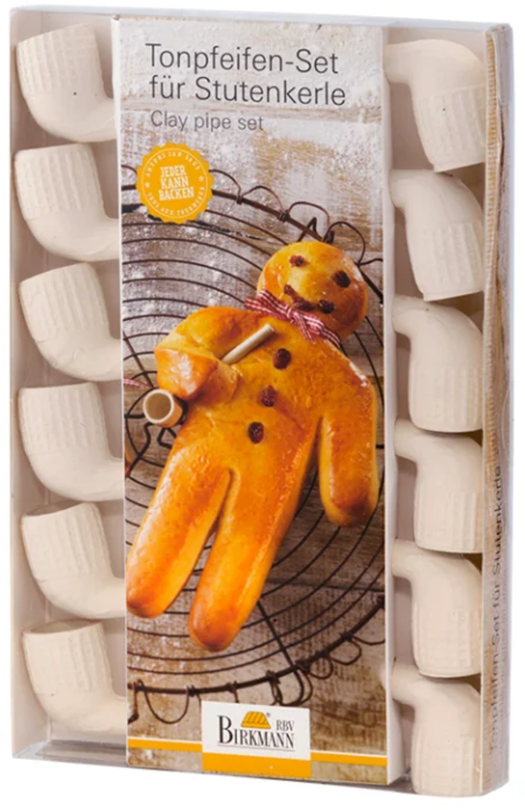 Met deze traditionele decoratieve pijpjes geef je je zelfgebakken Stutenkerl een klassieke, authentieke uitstraling. De pijpjes zijn 8 cm lang, gemaakt van ovenvaste klei en hittebestendig tot 230 °C – dus perfect om mee te bakken in de oven.