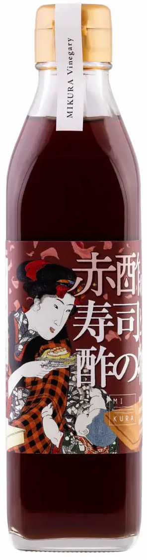 De in houten vaten gefermenteerde Japanse Mikura Sushi-azijn - Rode rijstazijn voor sushi – ontwikkelt door sakekasu, rietsuiker en zout een zachte, afgeronde zuurtegraad met een krachtige umami-toon. Past perfect bij sushi, dressings, sauzen en marinades. Kenmerkend is de bijzonder milde smaak en de subtiele roodachtige kleur met rijst.