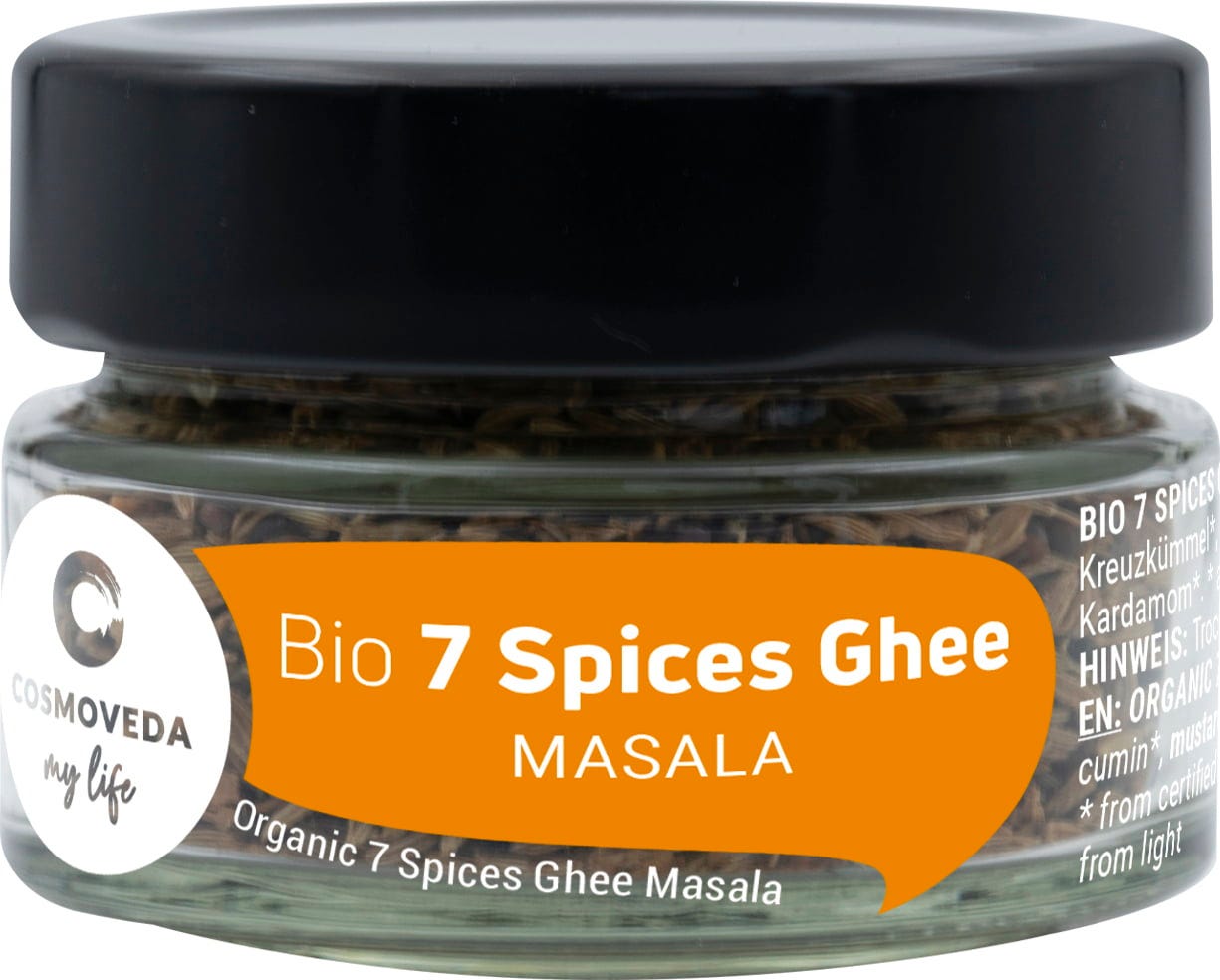 - 7 Spices Ghee Masala bevat kruiden die Agni, het spijsverteringsvuur, bevorderen.
