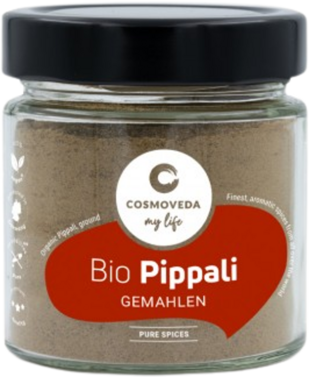 De pippali (lange peper) is een pittige zwarte peper die lijkt op een mengsel van kardemom, kruidnagel, nootmuskaat en peper.