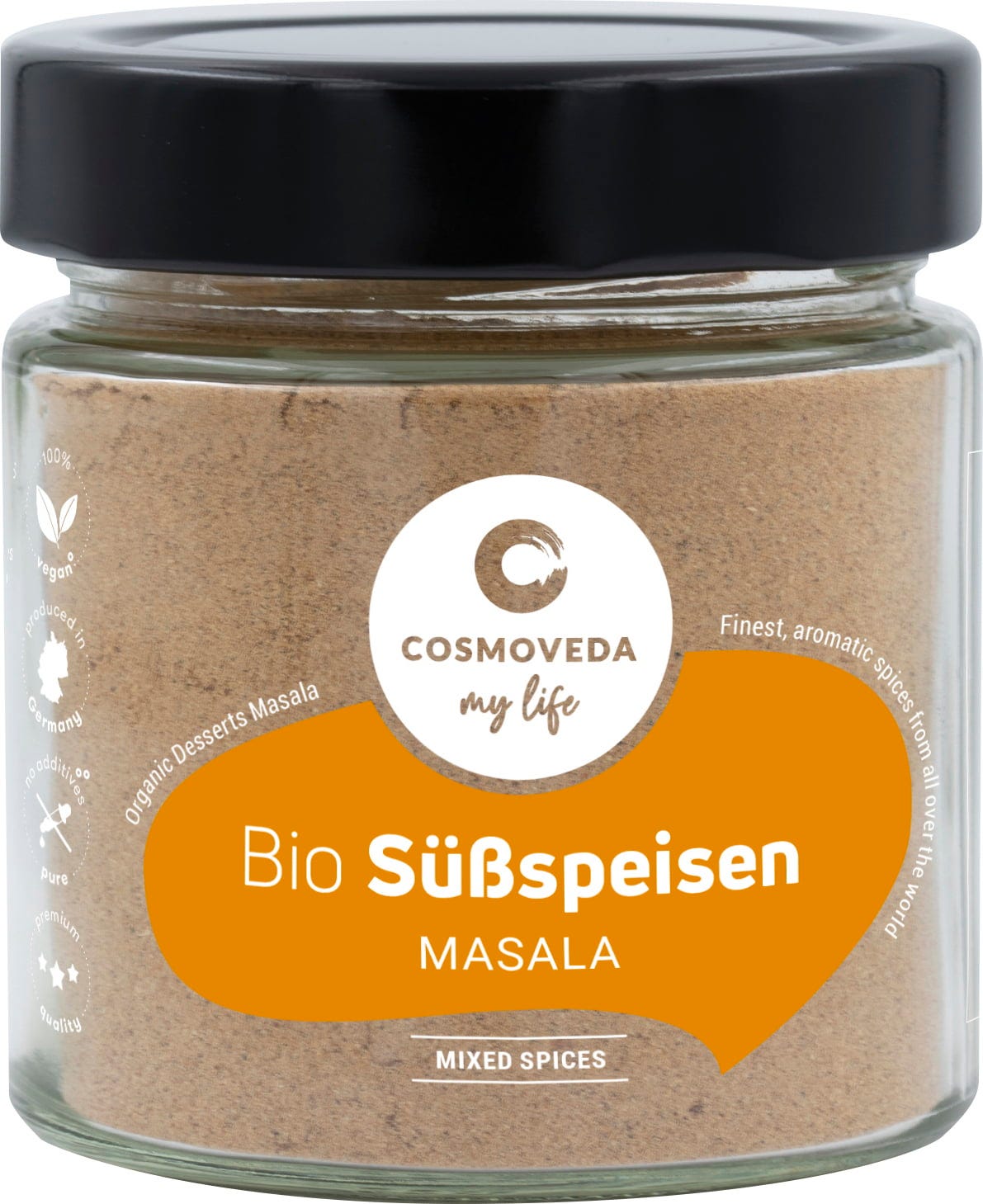 De Cosmoveda Bio Masala voor Desserts verrijkt desserts, zoete gerechten, taarten en gebak met een licht kruidig, heerlijk aroma van gember en kardemom.