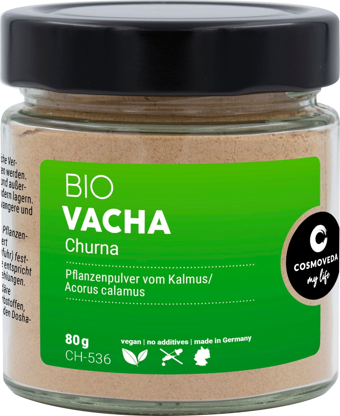 Vacha - Acorus calamus - is een 60-100 cm hoge plant met een duimdikke onderstam (wortelstok), die een driehoekige stengel vormt, zittend zwaardvormig blad en kleine groene bloemen. De wortel wordt gebruikt in de Ayurvedische voeding.