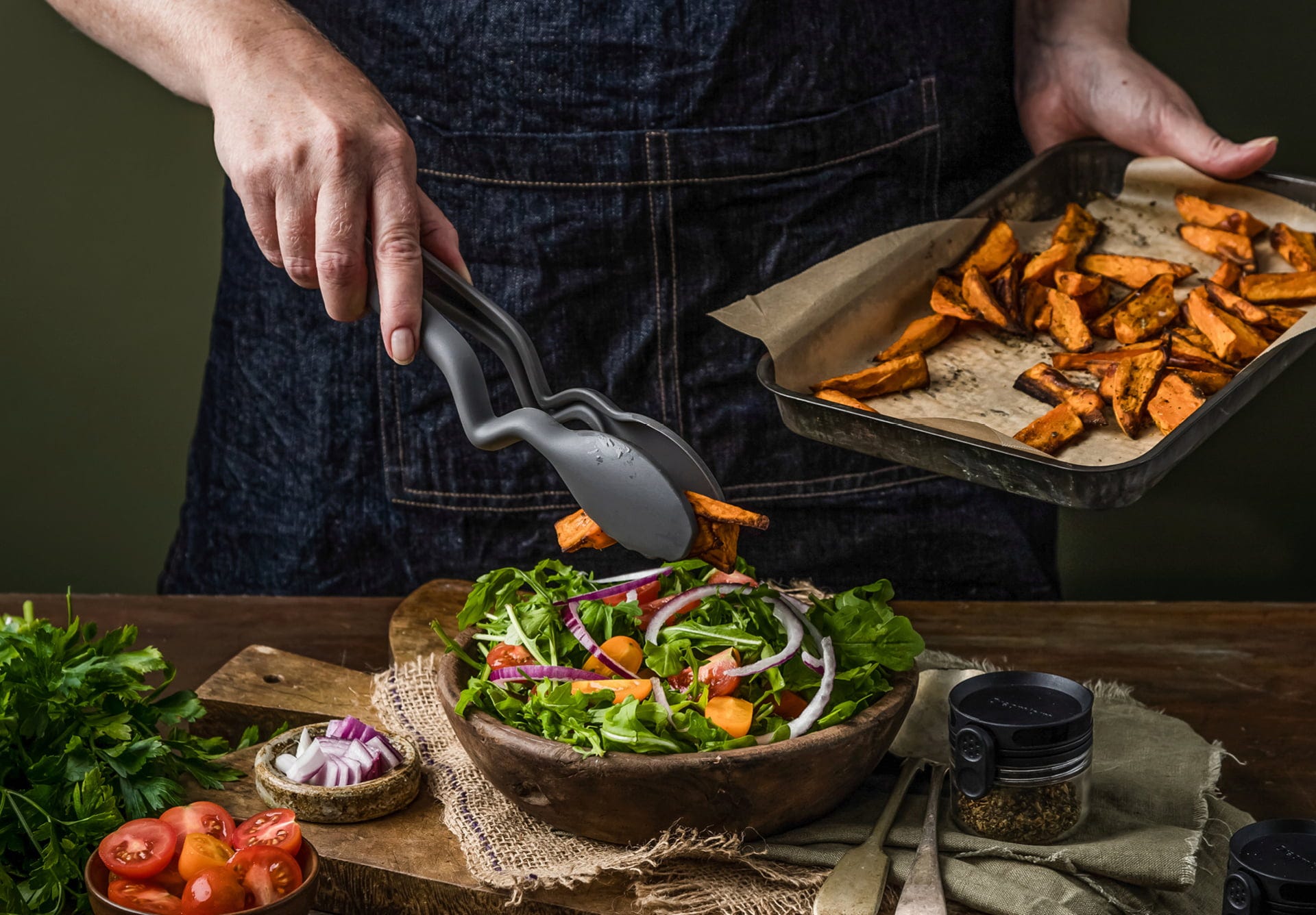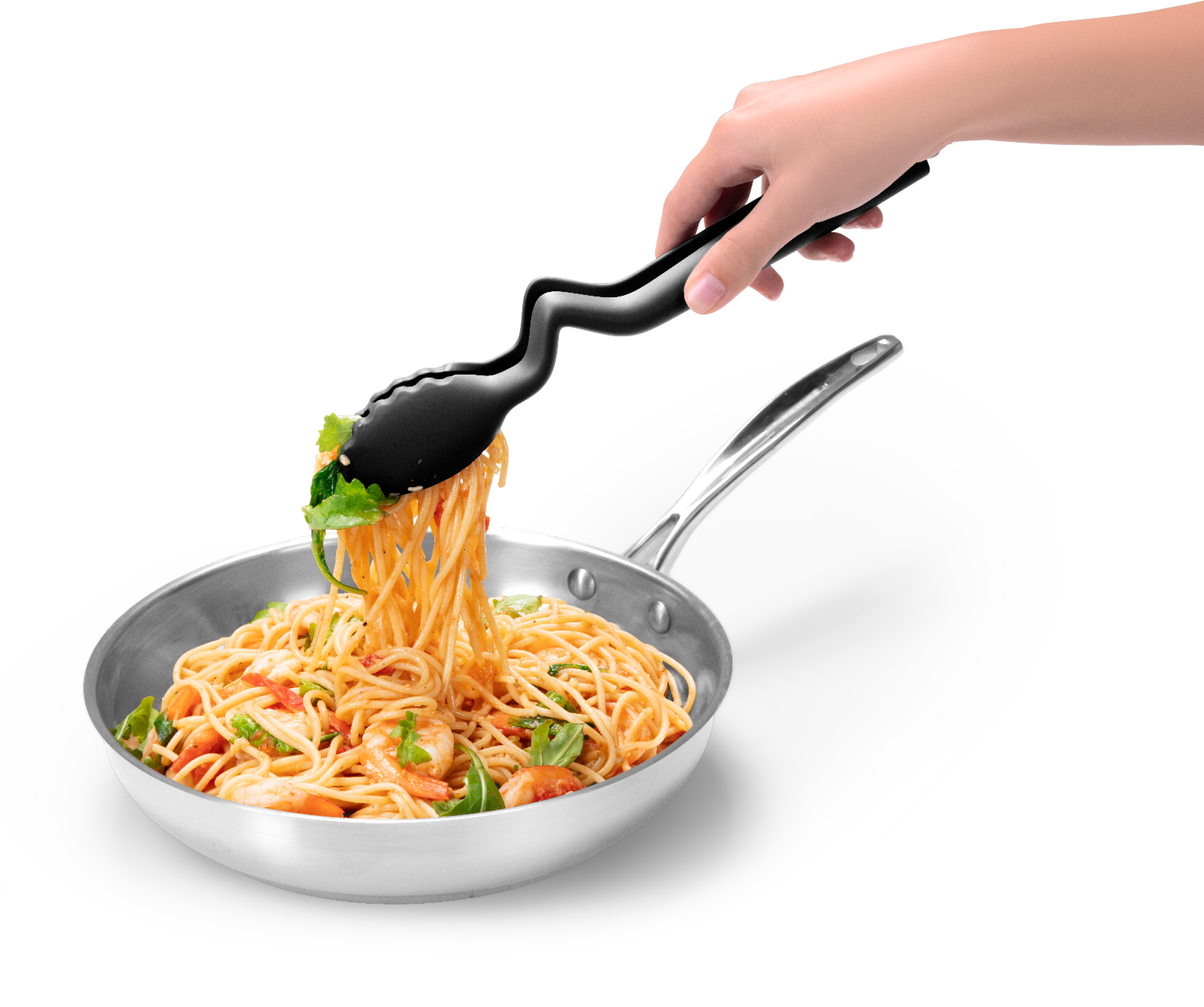 Vanaf nu blijft je aanrecht tijdens het koken schoon. Dankzij de innovatieve knik in de handgreep zweven de tangkoppen van de Clongs Lite van Dreamfarm altijd boven het werkblad of kunnen ze veilig direct aan de rand van de pan worden opgehangen! Met de handige kliksluiting aan het uiteinde van de handgreep open en sluit je de tang gemakkelijk met één hand en een druk op de knop.