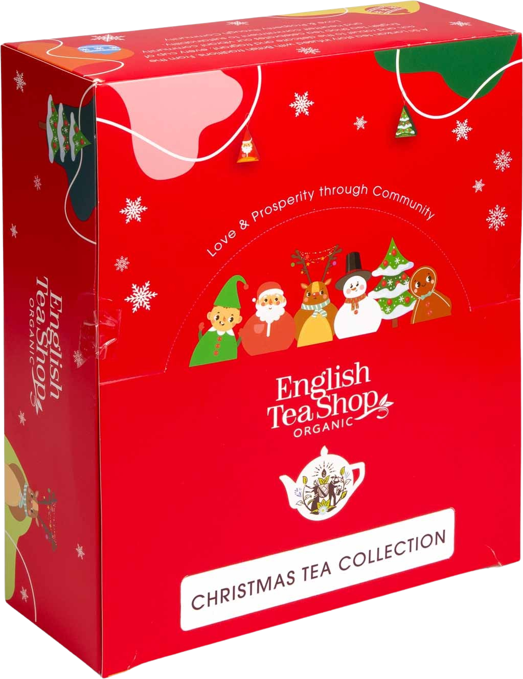 Deze feestelijke display van English Tea Shop bevat 3 x 10 verschillende kerstontwerpen, waaronder de kerstman, een sneeuwpop en kerstboom. De prachtig vormgegeven individuele verpakking bevat de volgende heerlijke biologische theesoorten: