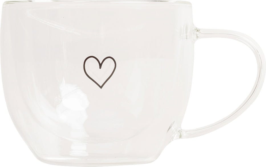 De dubbelwandige glazen mok met hartprint maakt thee en andere warme dranken tot een bijzondere ervaring. Dankzij het dubbelwandige design lijkt het drankje te zweven en blijft de buitenkant aangenaam koel – waar je de mok ook vastpakt, je vingers blijven beschermd. Het kleine zwarte hart op het glas maakt deze mok bovendien tot een echt pronkstuk en een charmante blikvanger op elke tafel.