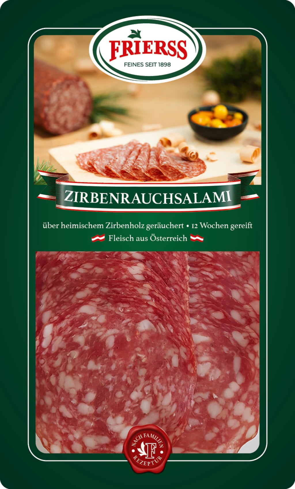De met pijnbomen gerookte salami van fijn Oostenrijks varkensvlees en spek wordt op Karinthische pijnboom gerookt en tien weken gerijpt tot de aroma's zich perfect hebben ontwikkeld. Fijn gesneden smaakt deze Oostenrijkse specialiteit heerlijk bij brood en canapés.