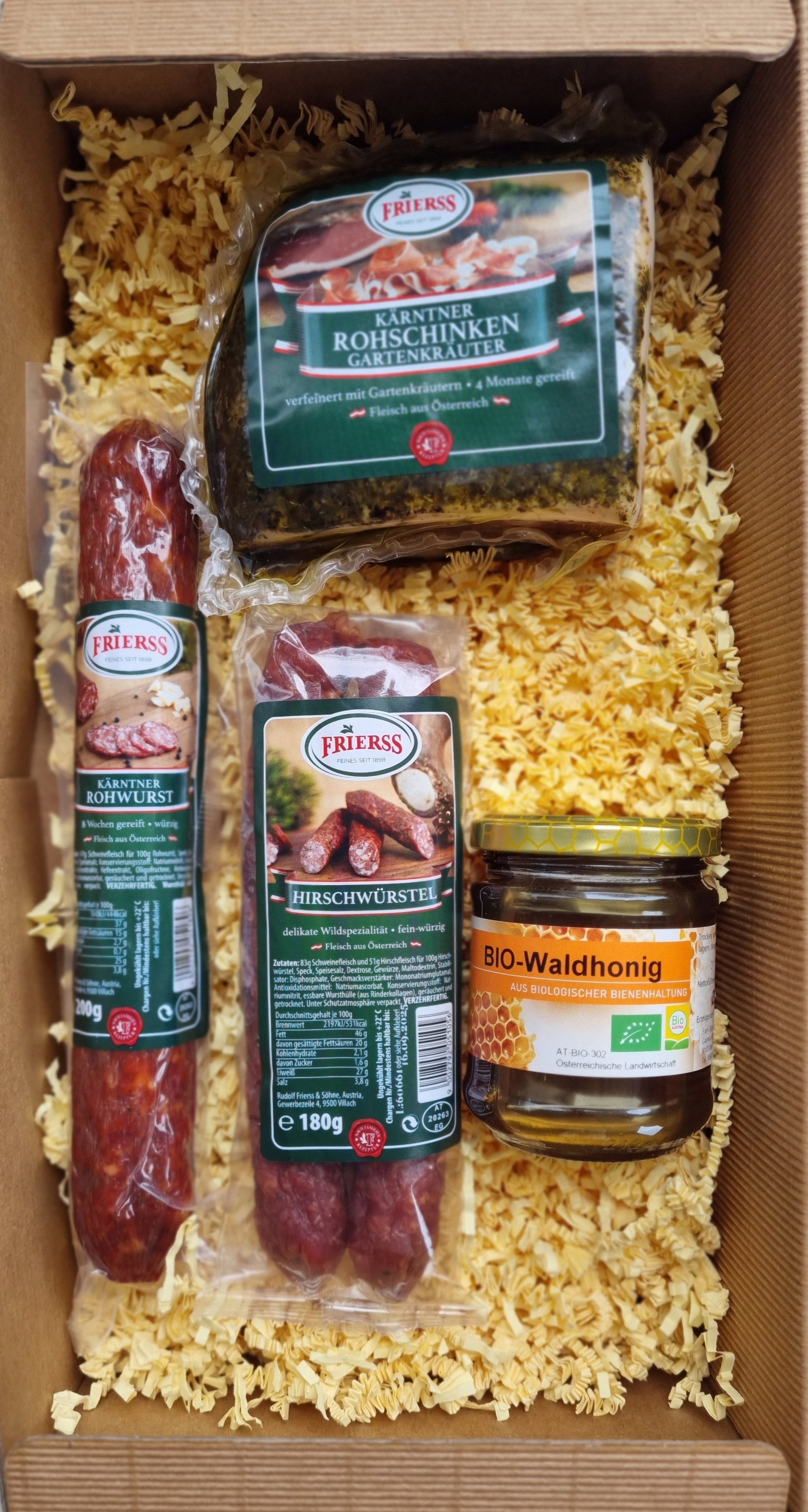 In deze set vind je echte schatten van de Karinthische traditie. Een perfect cadeau voor vleesliefhebbers en fijnproevers die zich zullen vermaken met Karinthische gezouten ham met kruiden, traditionele hertenworst en Karinthische droge worst. Om deze selectie van producten het beste af te sluiten is er een pot heerlijke kaneelhoning inbegrepen, voor momenten van waar genot.