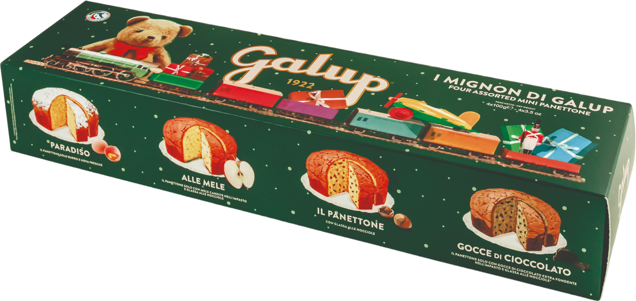 Deze exclusieve set bevat vier kleine panettones van elk 100 g. Elk van deze panettones is een echte traktatie voor het gehemelte en brengt een unieke verscheidenheid aan smaken op tafel. Als cadeau voor je geliefden of voor iedereen die gewoon niet kan beslissen over zijn favoriete smaak, biedt deze set een heerlijke oplossing!