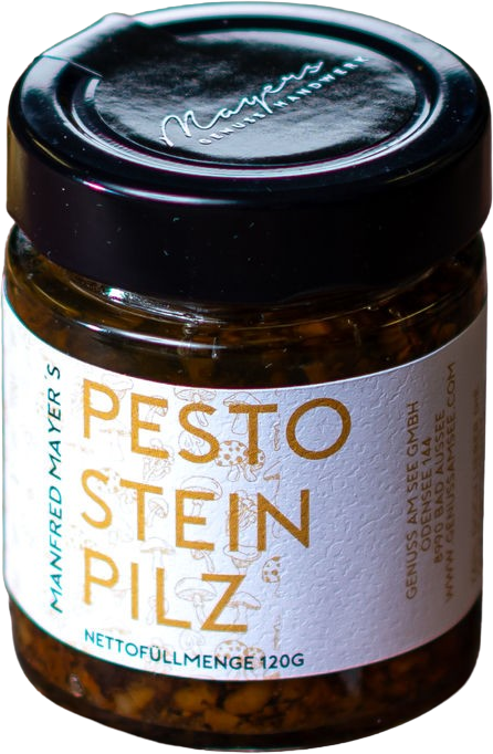 Koolzaadolie, Mandeln, 17 % gedroogde porcini paddestoelen, harde kaas (melk), Peterselie, Zout, citroensap, peper