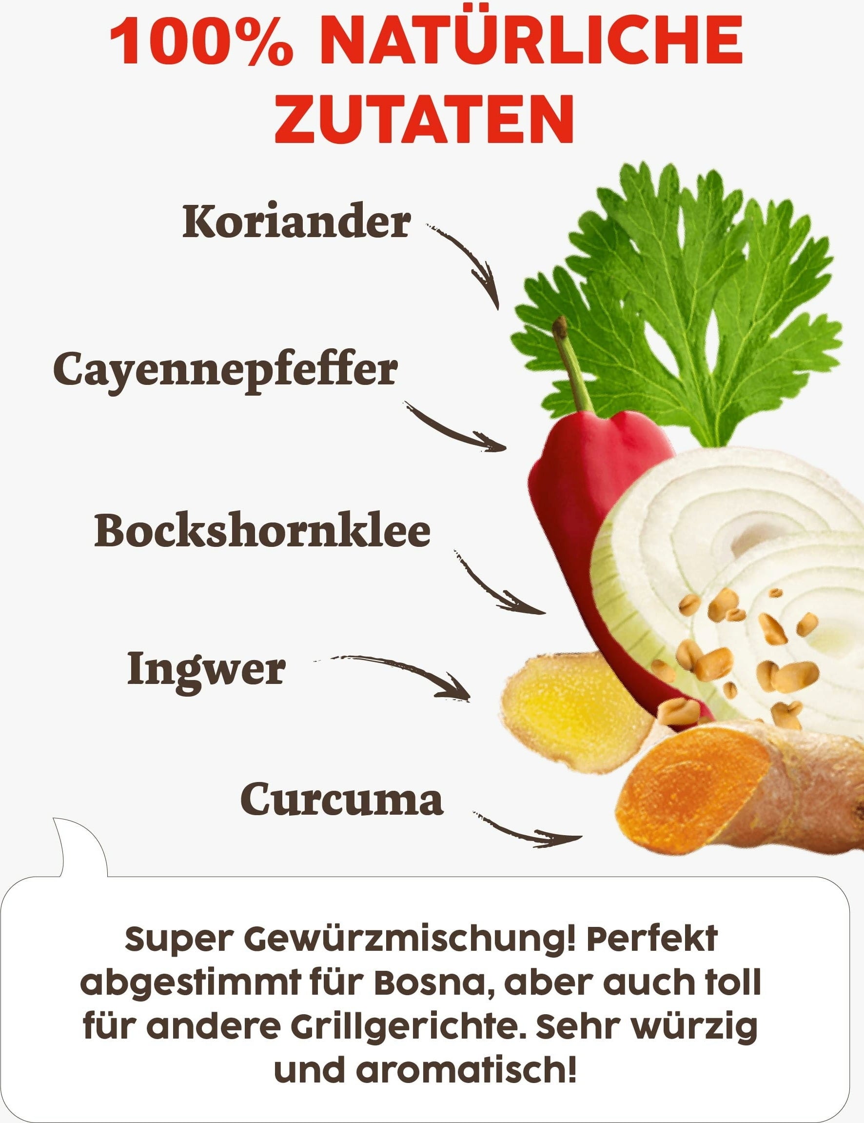 De beroemde Bosna-worst en zijn unieke aroma zijn afkomstig uit Bulgarije. De fijne samenstelling van paprika, kurkuma en koriander zorgen voor de onvergelijkbare smaak. De speciaal ontwikkelde kruidenbereiding van Kotányi is ideaal voor alle Bosna-creaties.