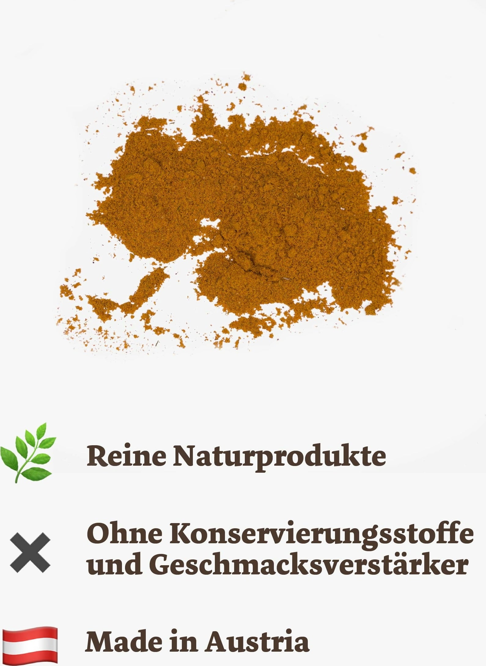 kurkuma, koriander, fenegriek, paprika, gember, komijn, knoflook, nootmuskaat, tafelzout, kaliumjodide, Peterselie, laurierbladeren, maïszetmeel, cayennepeper