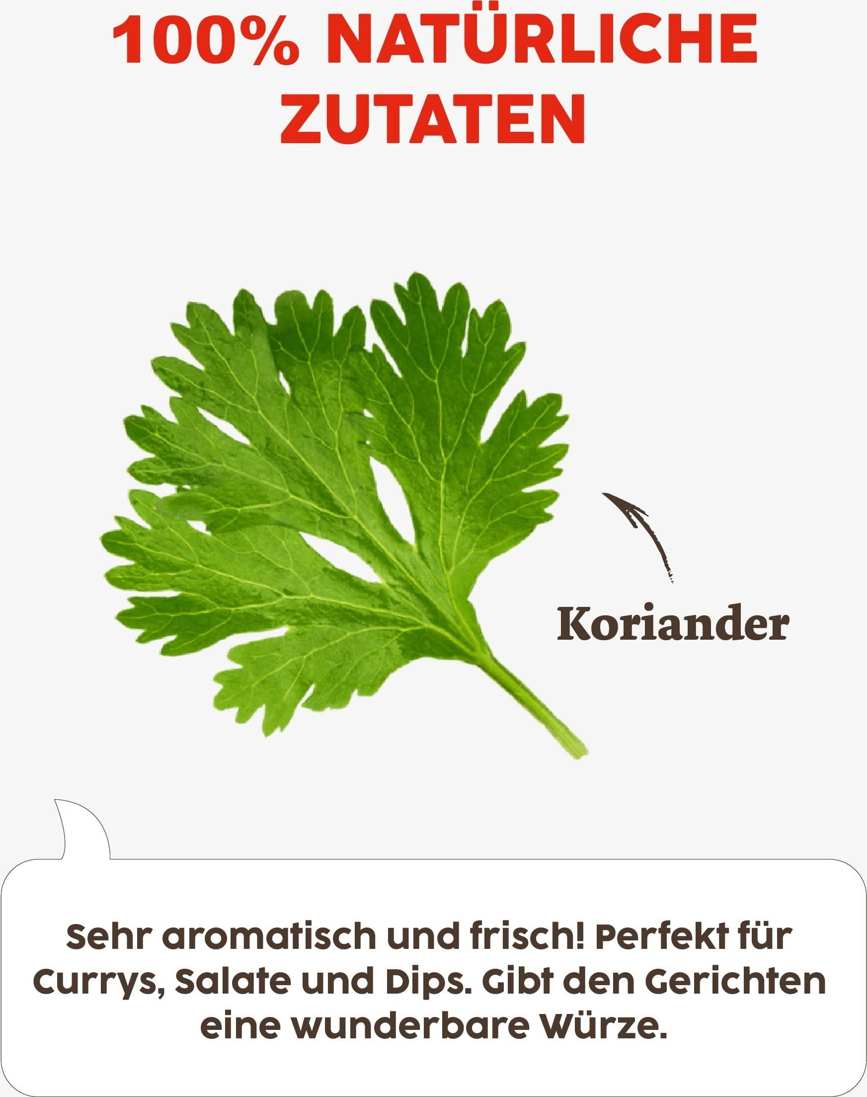 Korianderbladeren zijn over de hele wereld bekend als een edele specerij. Bovendien heeft koriander een citrusfrisse, enigszins muskusachtige smaak. Door de veelzijdige smaak kan koriander gebruikt worden voor baksels, sauzen, worsten, vlees-, groente- en linzengerechten.
