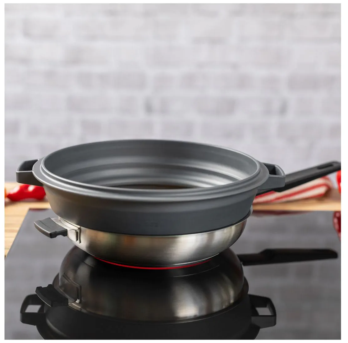 De perfecte aanvulling voor SMART & COMPACT koekenpannen, kan worden gecombineerd met de bijpassende 2-in-1 spatbescherming/zeef