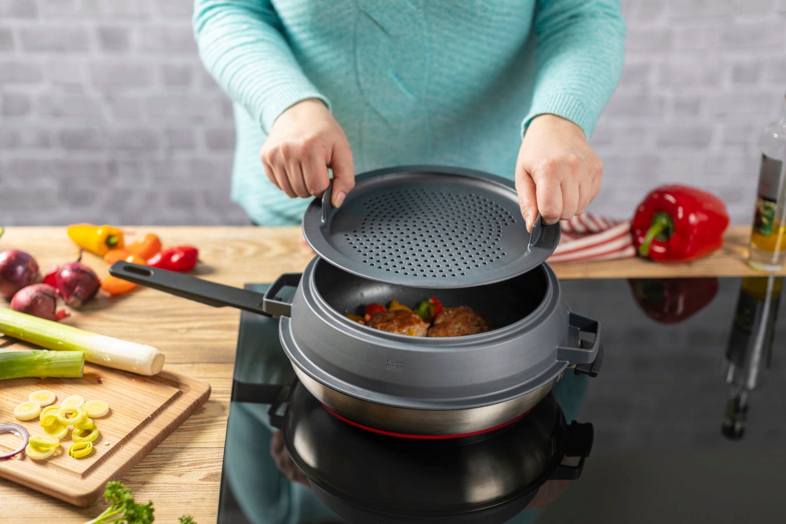 De conische spatbescherming maakt koken nog gemakkelijker. Het beschermt de kookplaat en het werkblad tegen ongewenste vetspatten en hoeft niet verwijderd te worden bij het roeren en draaien.