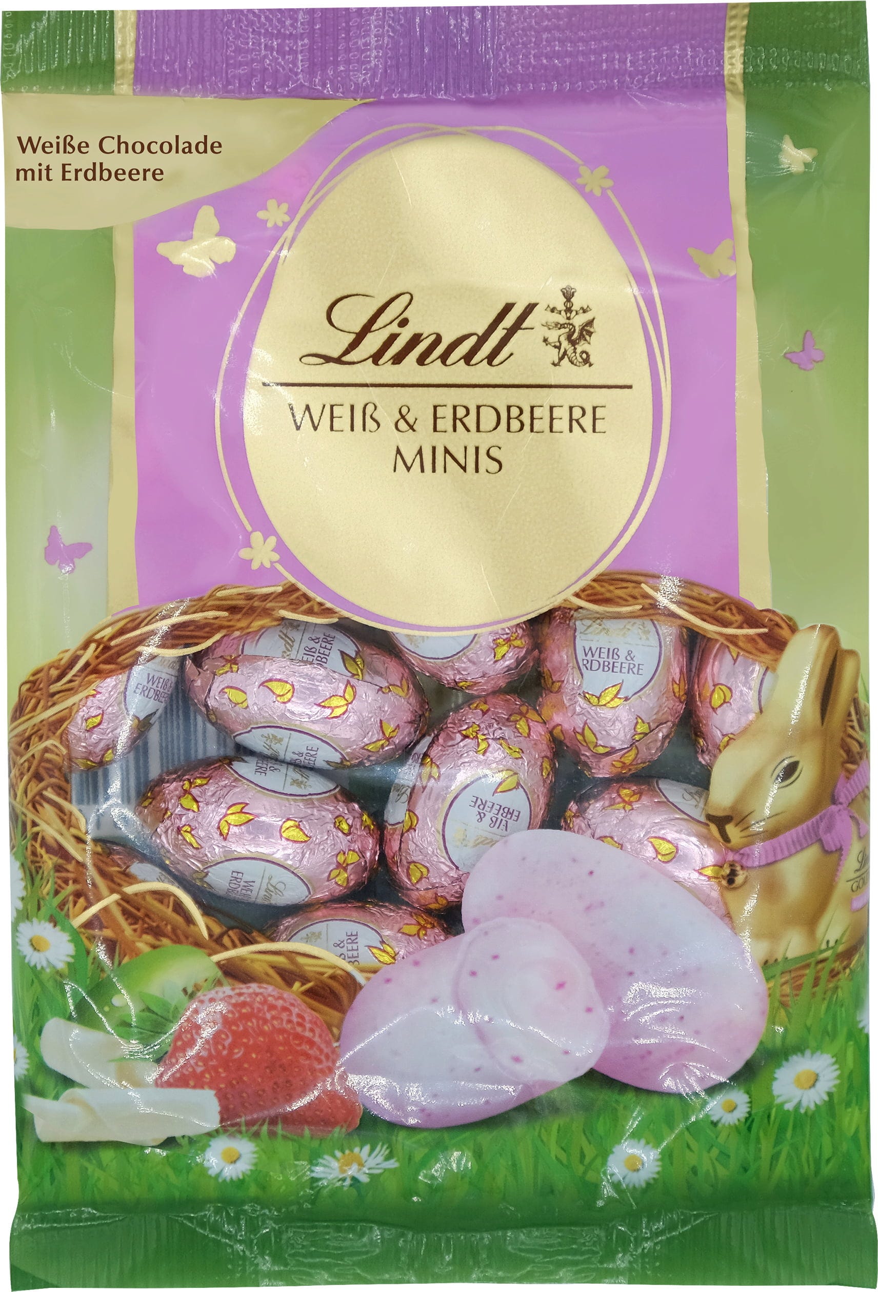 Witte chocolade met aardbeiensmaak - de aardbeieneieren van Lindt brengen fruitige variatie in elk paasmandje. De zoete eieren vormen ook een prachtige decoratie op tafel en zullen gegarandeerd in de smaak vallen bij chocoladeliefhebbers van jong tot oud.