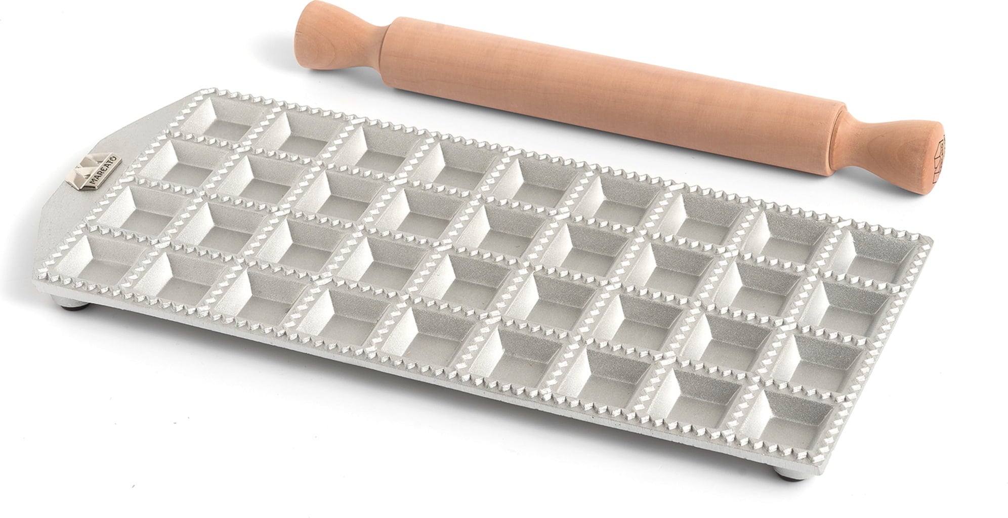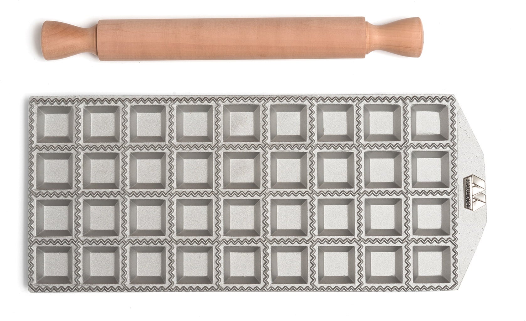De prachtige bakvorm voor ravioli is verkrijgbaar in verschillende maten en er wordt ook een deegroller van massief hout meegeleverd, die een oppervlak heeft van natuurlijke was en lasergegraveerd is. Bovendien heeft de deegroller een ergonomische vorm waardoor het handvat stabiel en gemakkelijk te gebruiken is.