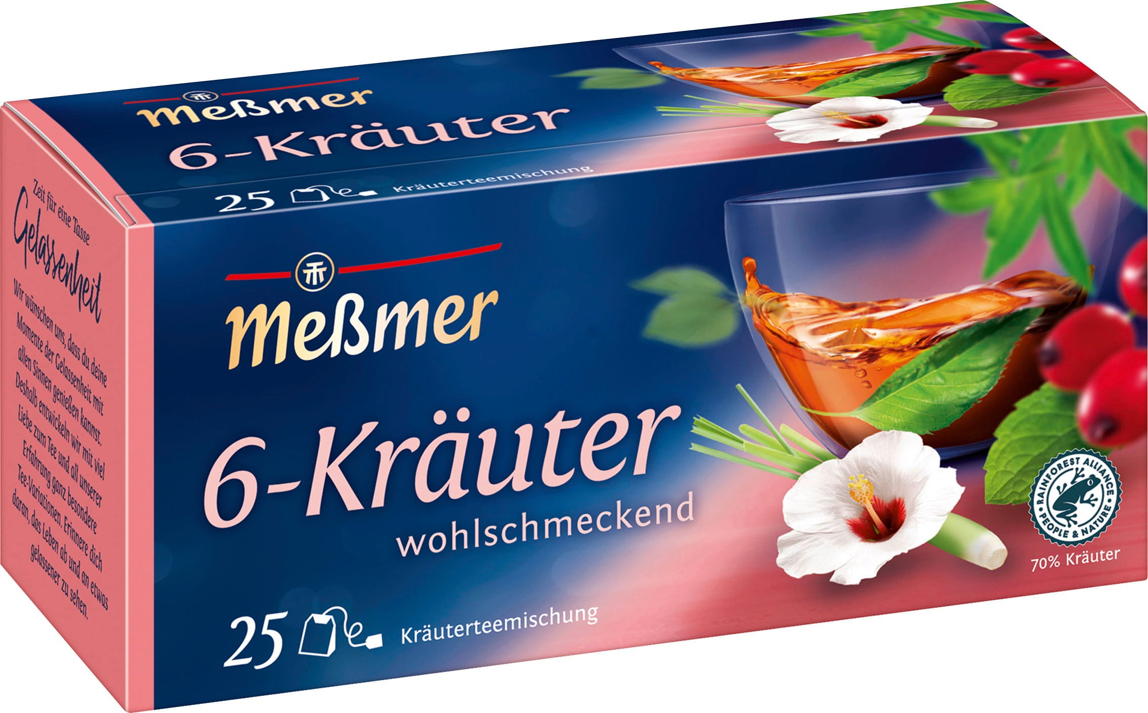 Laat je betoveren door de verse verscheidenheid van exquise kruiden met Meßmer's 6-kruidenthee. Pepermunt, citroengras, hibiscus, rozenbottel, bramenblaadjes en citroenverbena vormen samen een harmonieuze smaakervaring.