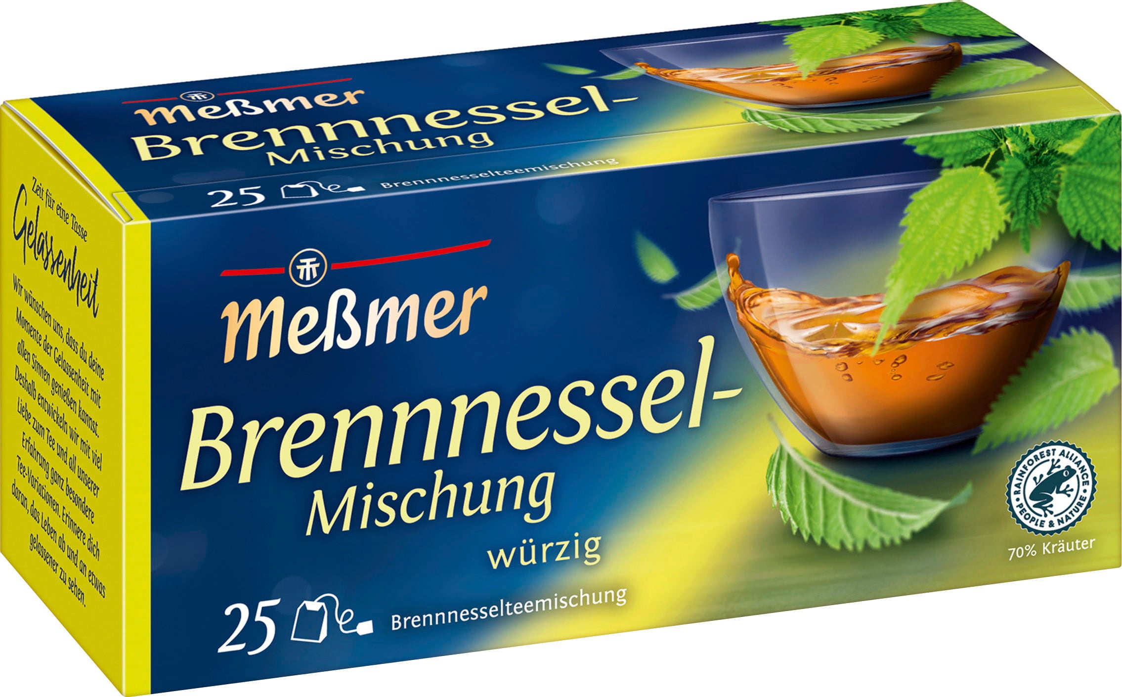 De Meßmer brandnetelmelange combineert de sterke smaak van brandnetel met braamblad, venkel en zoethoutwortel. Een uitgebalanceerde kruidenthee met een kruidig-scherpe toets en een volle smaak.