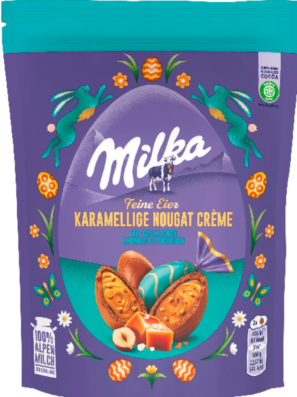 Deze Milka-eieren combineren de bekende, zacht smeltende Alpenmelkchocolade met een bijzonder romige karamel-nougatcrème binnenin. De fijne vulling wordt aangevuld met knapperige, licht gezouten karamelstukjes, die zorgen voor een spannend samenspel van zoet en hartige knapperigheid. Elk van de individueel verpakte chocolade-eieren is een heerlijk verwenmoment dat perfect is voor de paastijd.