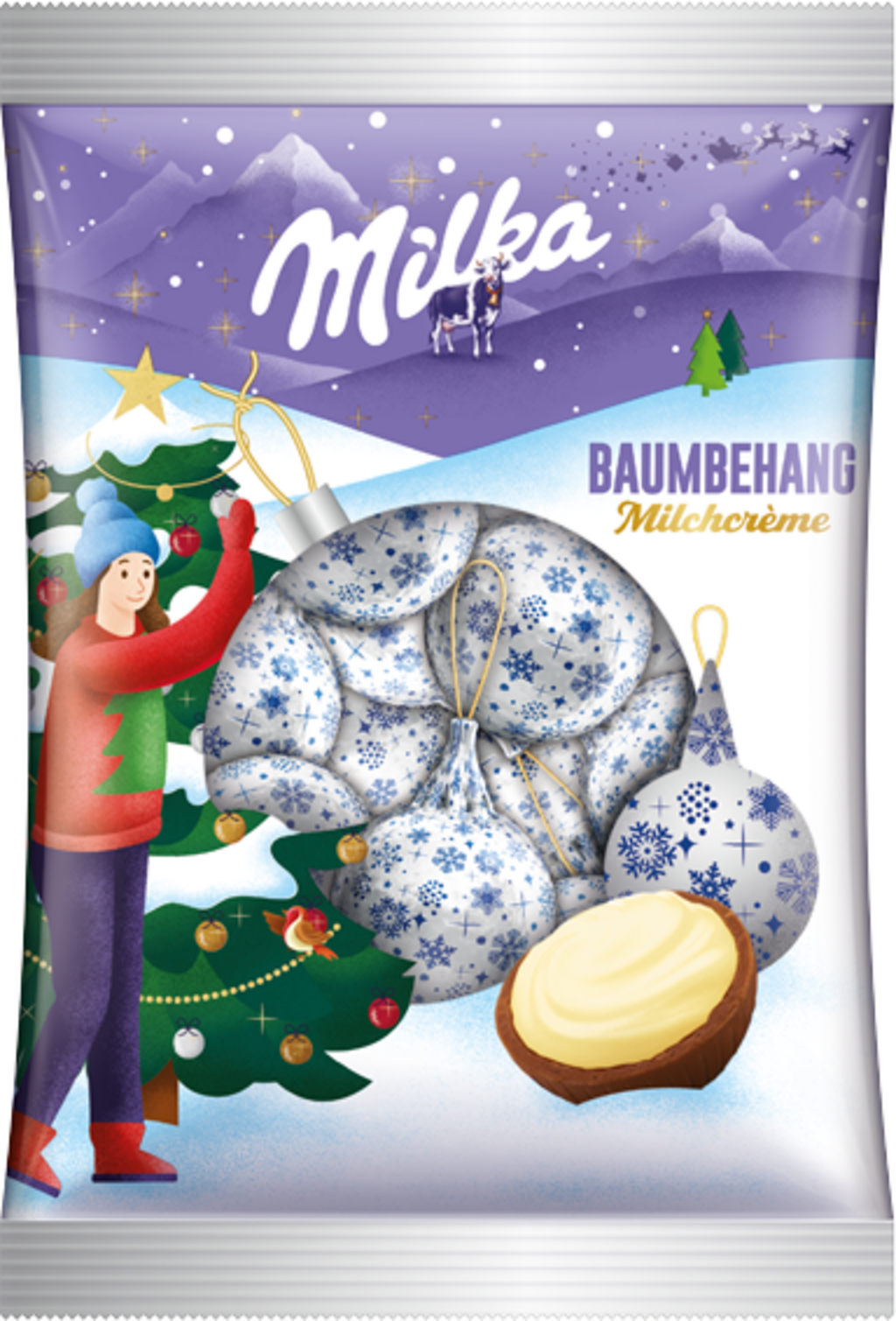 Zachte alpenmelkchocolade gevuld met milde melkcrème - deze kerstballen zijn de ideale boomversiering voor gezinnen met jongere kinderen! Natuurlijk zijn de kerstballen ook geschikt voor het vullen van zelfgemaakte adventskalenders of als decoratie.