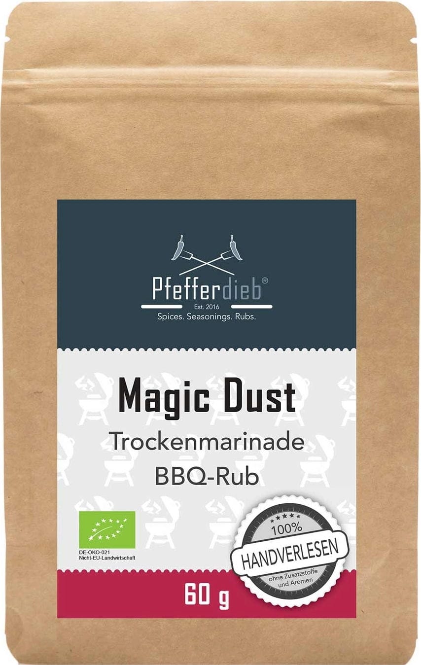 De biologische Magic Dust premium barbecuekruiden van Pfefferdieb zullen je verblijden met hun intense hitte en unieke smaak. Paprikapoeder, knoflook, chilipoeder en komijn toveren je gegrilde vlees om tot malse, perfect gekruide lekkernijen!