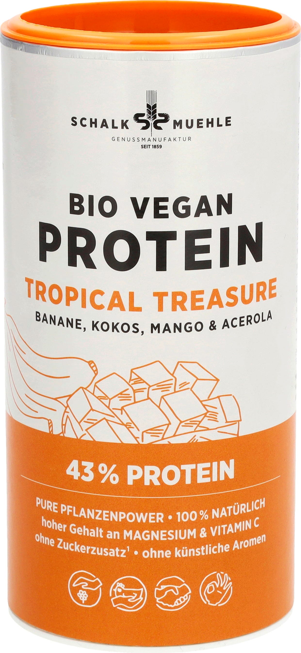 Banaan, mango, kokosnoot en acerola zetten hier de toon - het vegan biologische Tropical Treasure proteïnepoeder van Schalk Mühle maakt indruk met zijn fruitige, exotische smaak en hoge magnesium- en vitamine C-gehalte. Als shake, in muesli, yoghurt of smoothie - het proteïnepoeder vult je dagelijks leven op verschillende manieren aan. En het beste van alles is dat het recept volledig vrij is van kunstmatige smaakstoffen en toegevoegde suiker. Dus niets staat je evenwichtige voeding in de weg.