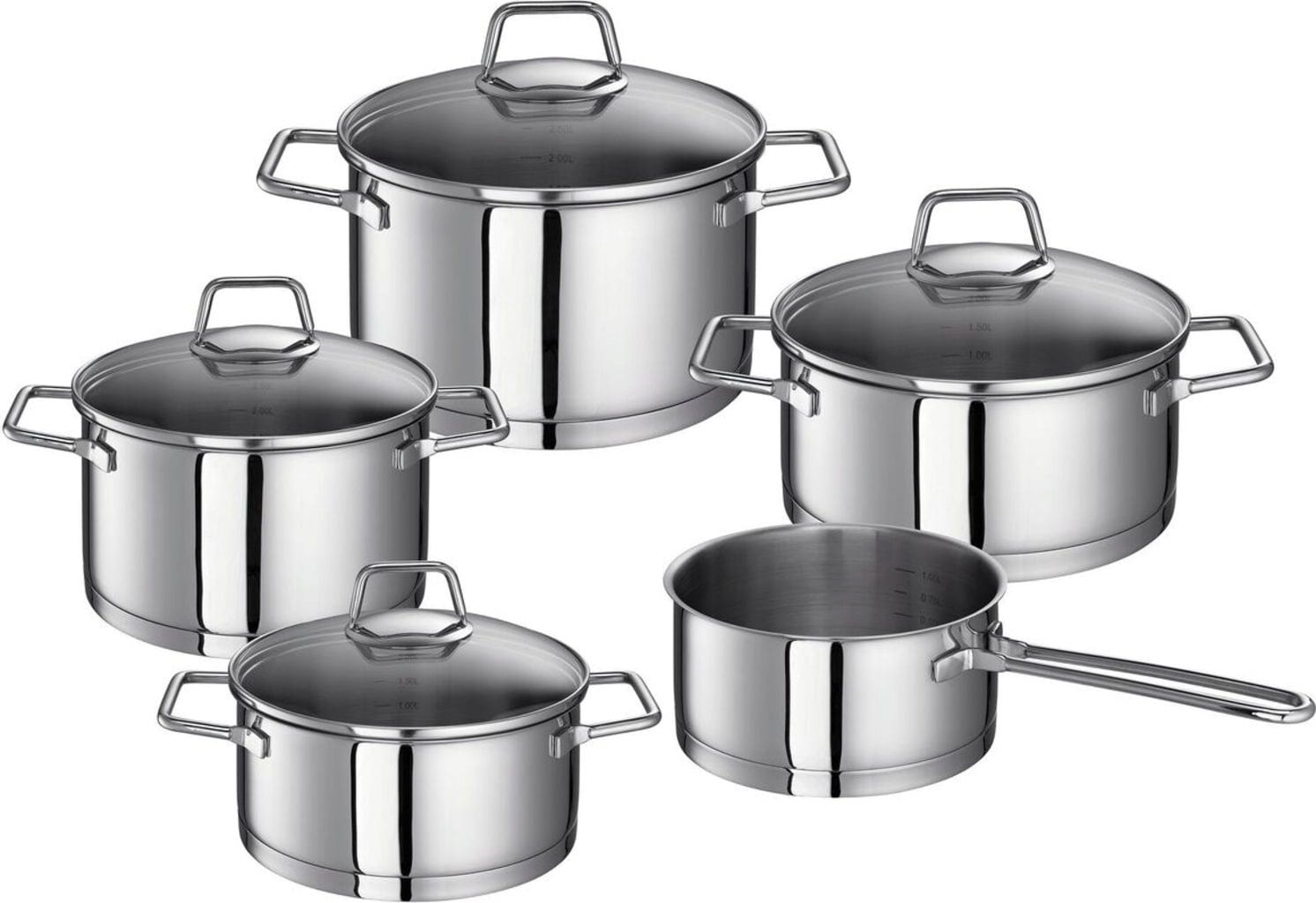 Twee braadpannen, twee vleespannen en een steelpan voor onbeperkte keukenavonturen. Ze zijn gemaakt van roestvrij staal en uitgerust met een energiebesparende ecotherm® all-stove aluminium capsulebodem. Dit betekent dat ze gebruikt kunnen worden met alle standaard kookplaten.
