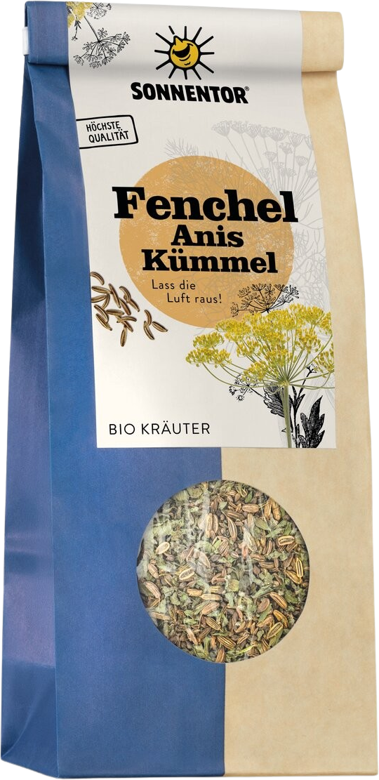 Met deze beproefde trioformule van venkel, anijs en komijn schenk je jezelf het ideale sluitstuk van je maaltijd in een kop. Deze losse biologische theemelange van Sonnentor overtuigt met een uitgesproken smaakprofiel: je proeft een harmonieuze combinatie van kruidige en aangenaam zoetige tonen, gedragen door de etherische aroma’s van de afzonderlijke ingrediënten.