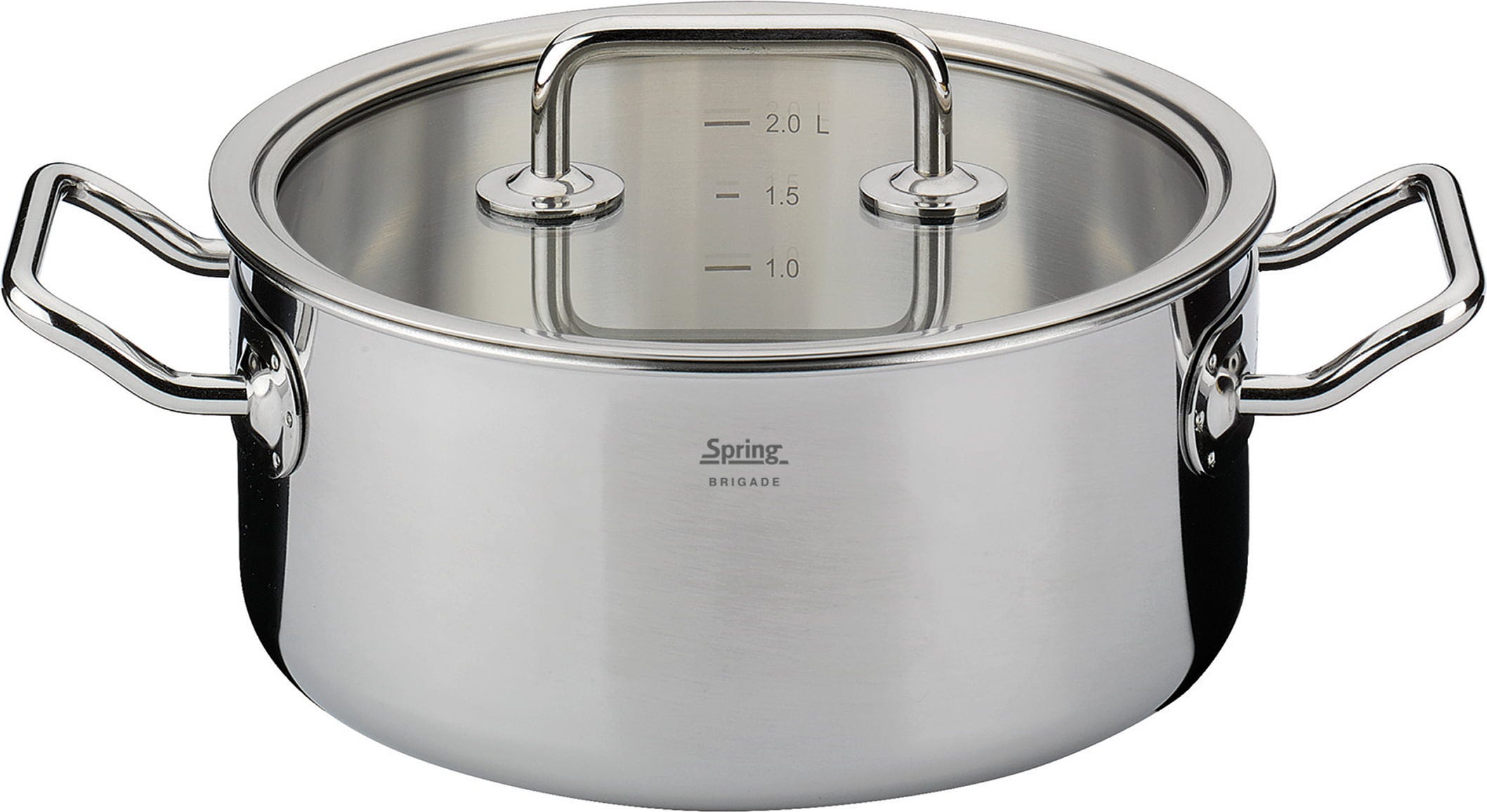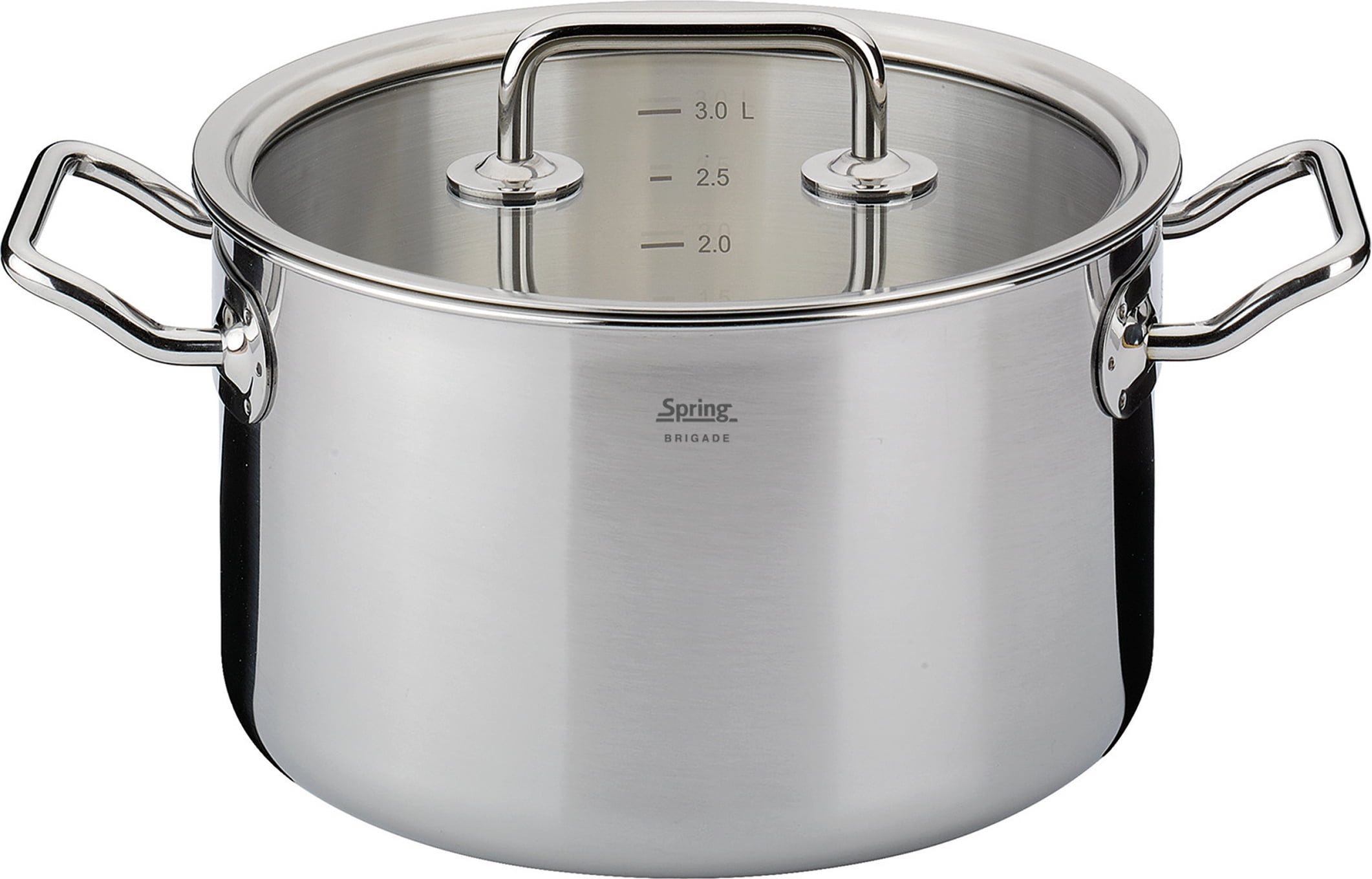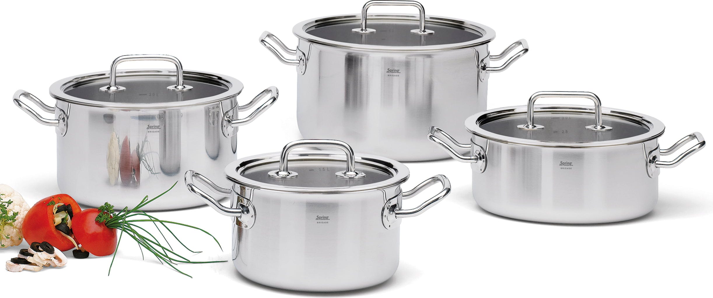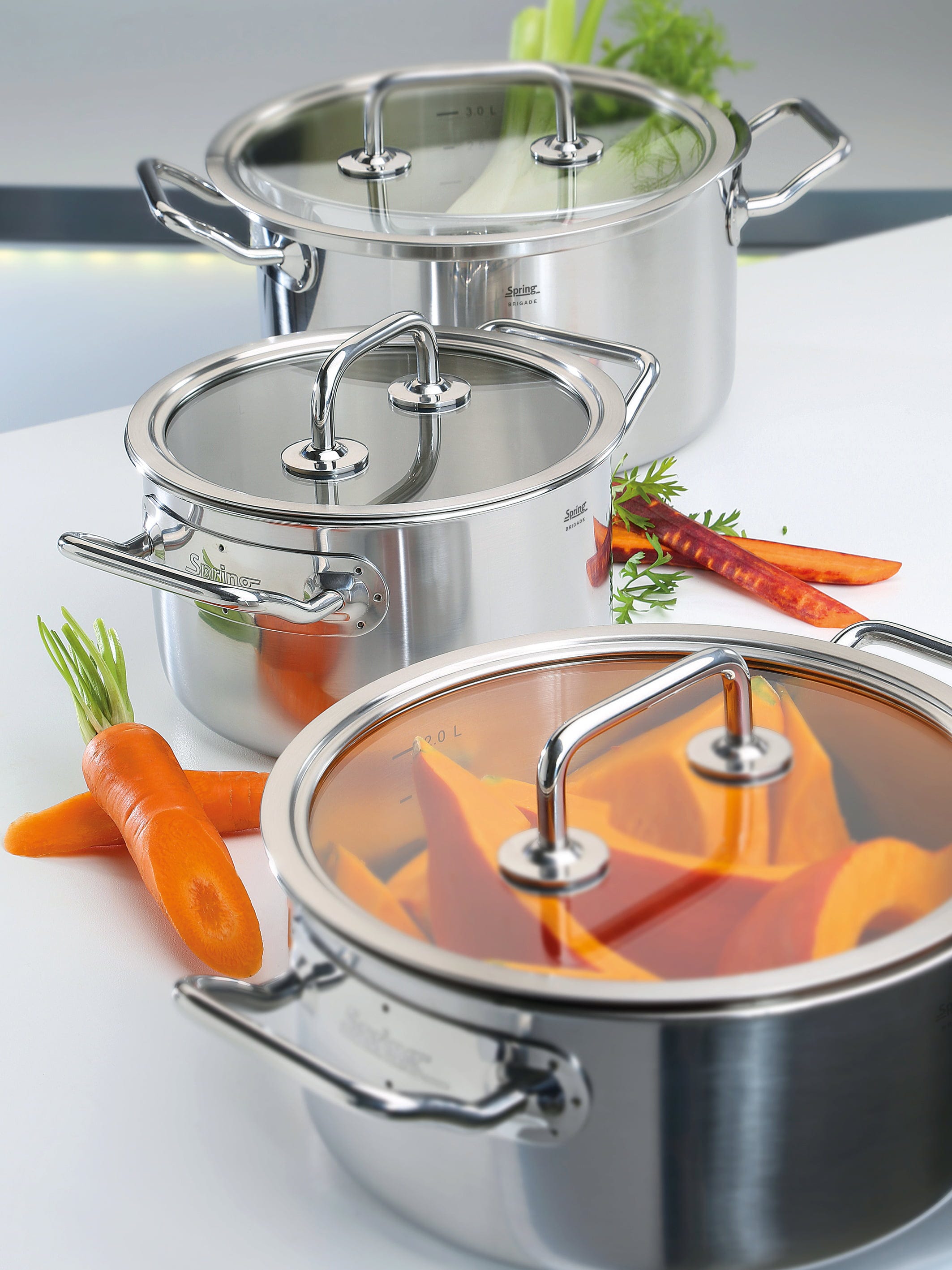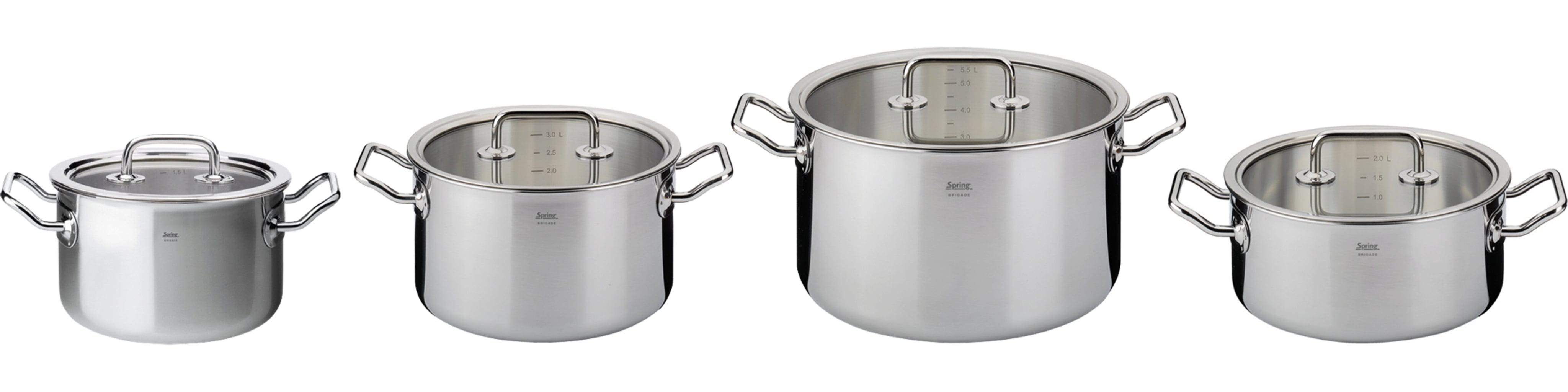 Met de vierdelige kookpannenset uit de Brigade Basic-serie van Spring haal je echte professionele prestaties in huis! Elke pan overtuigt door een hoogwaardig 5-laags meerlagenmateriaal, dat de hitte niet alleen bij de bodem houdt, maar deze bliksemsnel tot aan de bovenste rand geleidt – zo bespaar je waardevolle tijd en energie bij elk gerecht. De ergonomisch gevormde koudgrepen blijven tijdens het koken aangenaam koel, terwijl je door de perfect passende glasdeksels je eten altijd in het oog houdt zonder dat er waardevolle warmte ontsnapt.