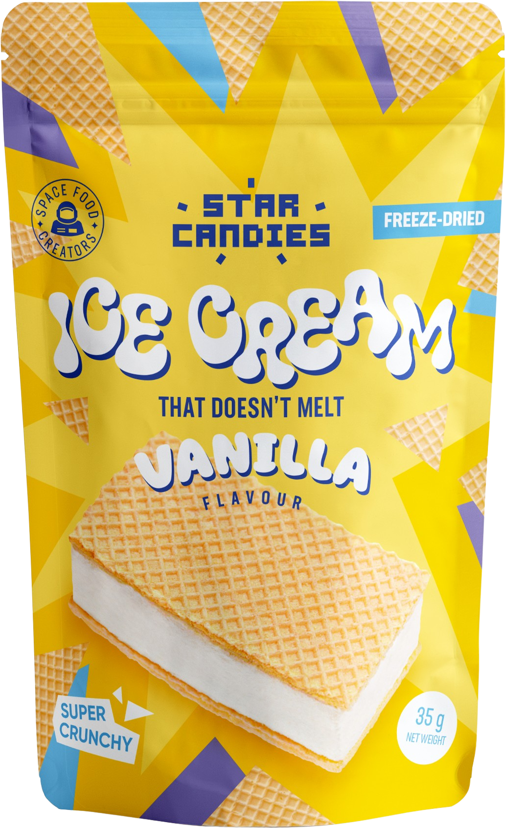 Ontdek de STAR CANDIES gevriesdroogde ijssandwich met vanillesmaak van Supergarden! Dit innovatieve dessert is eigenlijk een ijsje dat niet smelt! Stel je voor: de volle, heerlijke smaak van je favoriete vanille ijsje, maar altijd knapperig en superpraktisch - je hoeft het niet in de vriezer te bewaren!
