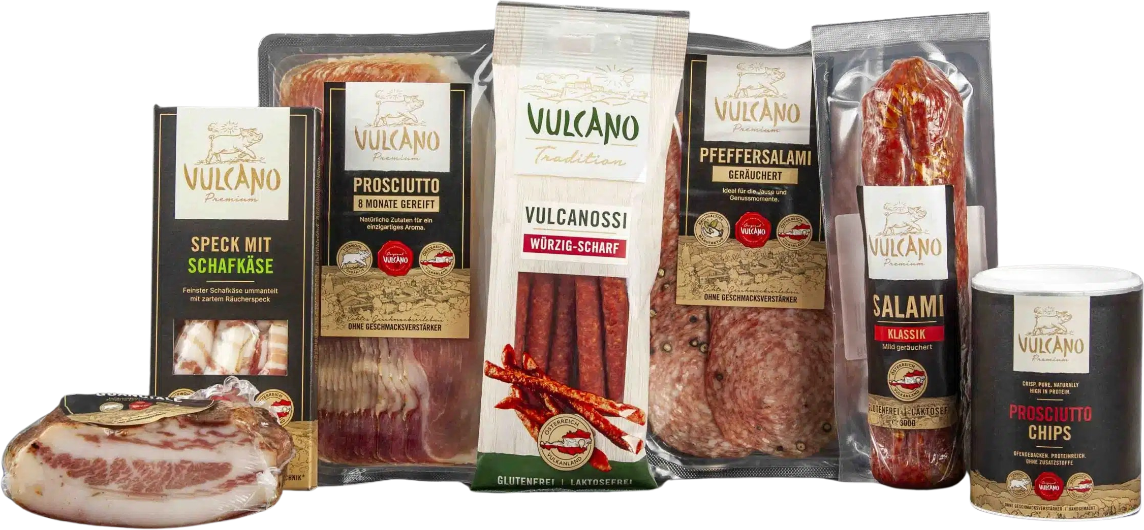 De doos bevat vlees- en worstproducten van Vulcano, rechtstreeks uit het Stiermarkse Vulkanland: