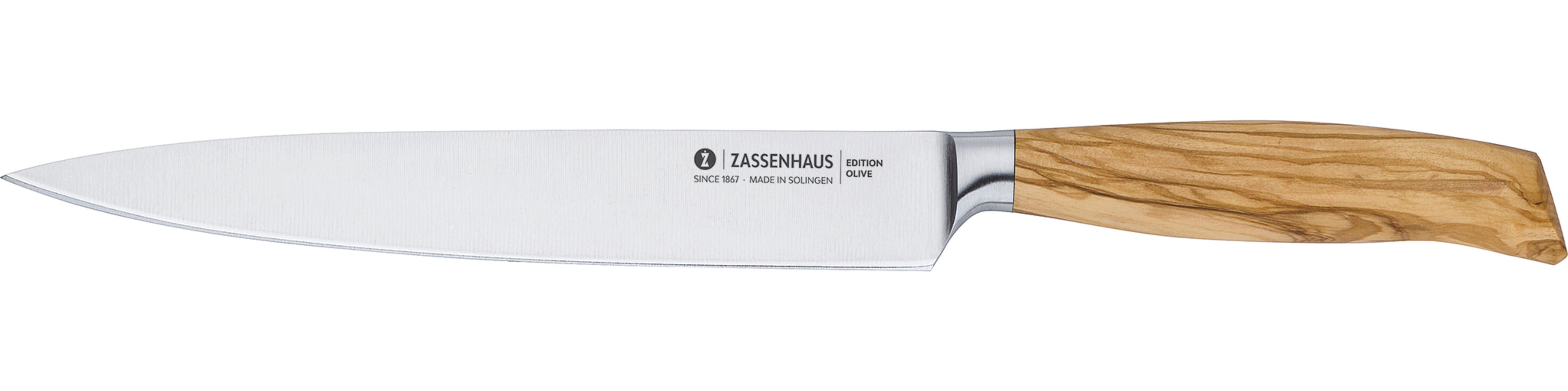 Het EDITION OLIVE hammes van Zassenhaus is perfect voor flinterdunne, gelijkmatige plakjes. Het lange, handgesmede lemmet glijdt moeiteloos door gebraad, ham, fruit en groenten. Het ergonomische olijfhouten handvat ligt comfortabel in de hand, waardoor snijden en garneren bijzonder gemakkelijk wordt. Een onmisbaar stuk gereedschap voor iedereen die waarde hecht aan precisie en stijl in de keuken.