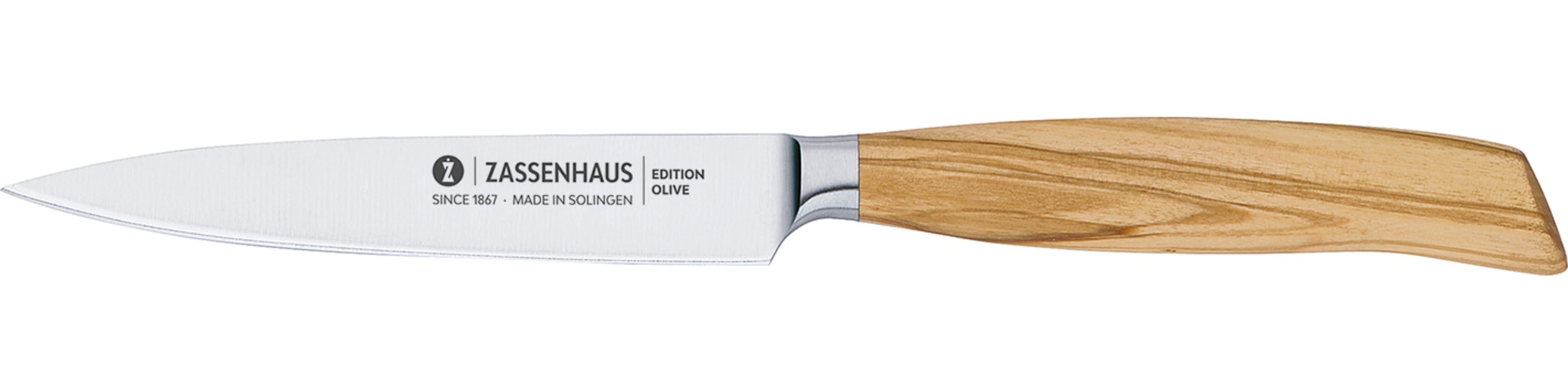 Het EDITION OLIVE spickmes van Zassenhaus is een meesterwerk van echt Solings smeedwerk. Het met de hand geslepen lemmet van hoogwaardig speciaal staal overtuigt door zijn uitzonderlijke scherpte en duurzaamheid. Het ergonomische handvat van fijn generfd olijfhout ligt prettig in de hand en geeft het mes een warme, natuurlijke uitstraling. Ideaal om te spicken, snijden en garneren - een stijlvolle partner voor gepassioneerde koks.