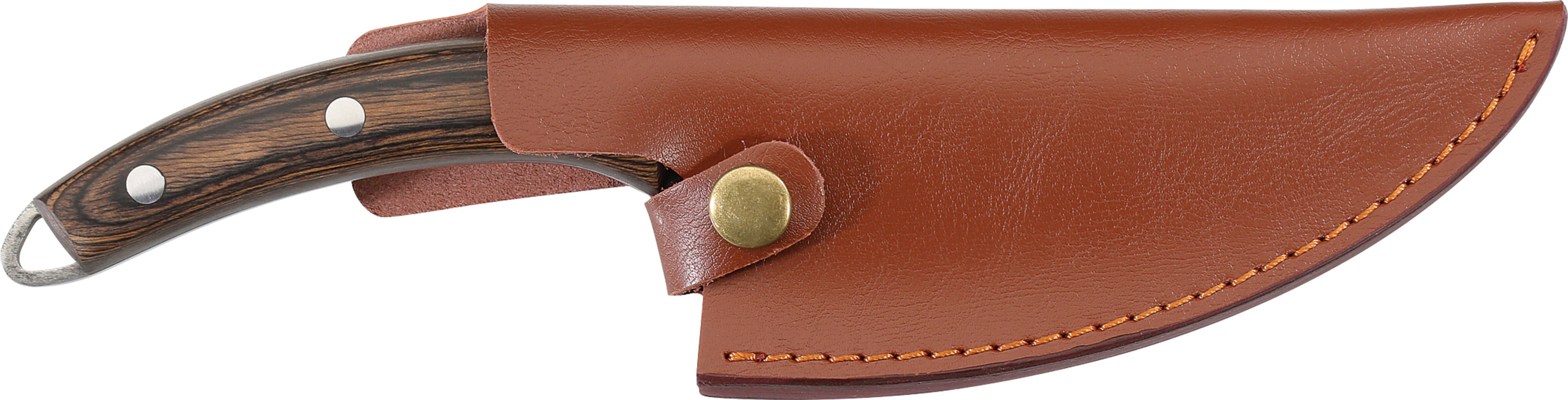 Dankzij de praktische leren schede met riemlus heb je het mes altijd snel bij de hand – een must-have voor zowel outdoorliefhebbers als hobbykoks.