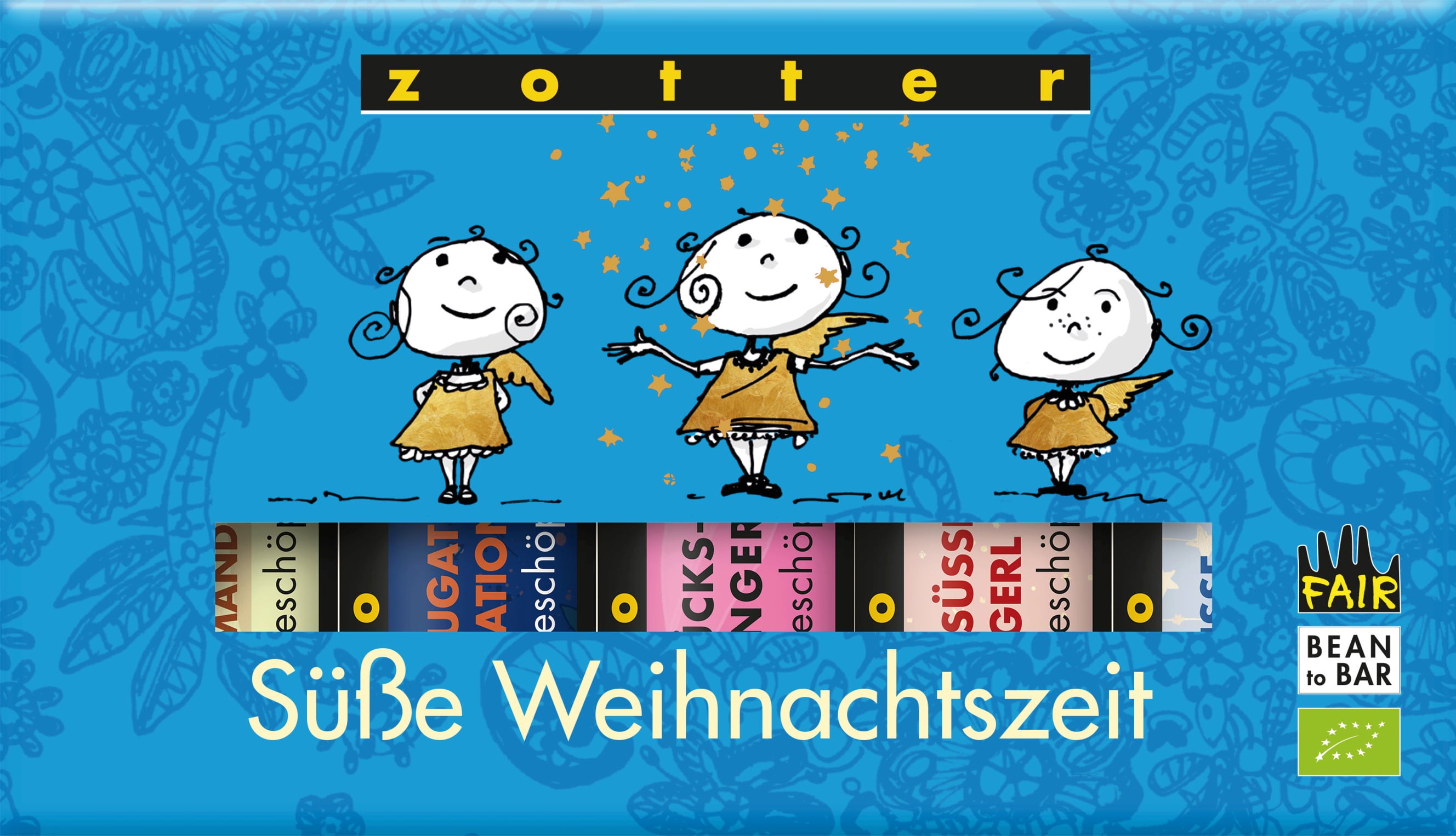 - Für süße Engerl: De populaire "SchokoBiene mit Honigblättchen"-variant (witte chocolade met karamelchips) in een kerstachtig jasje.