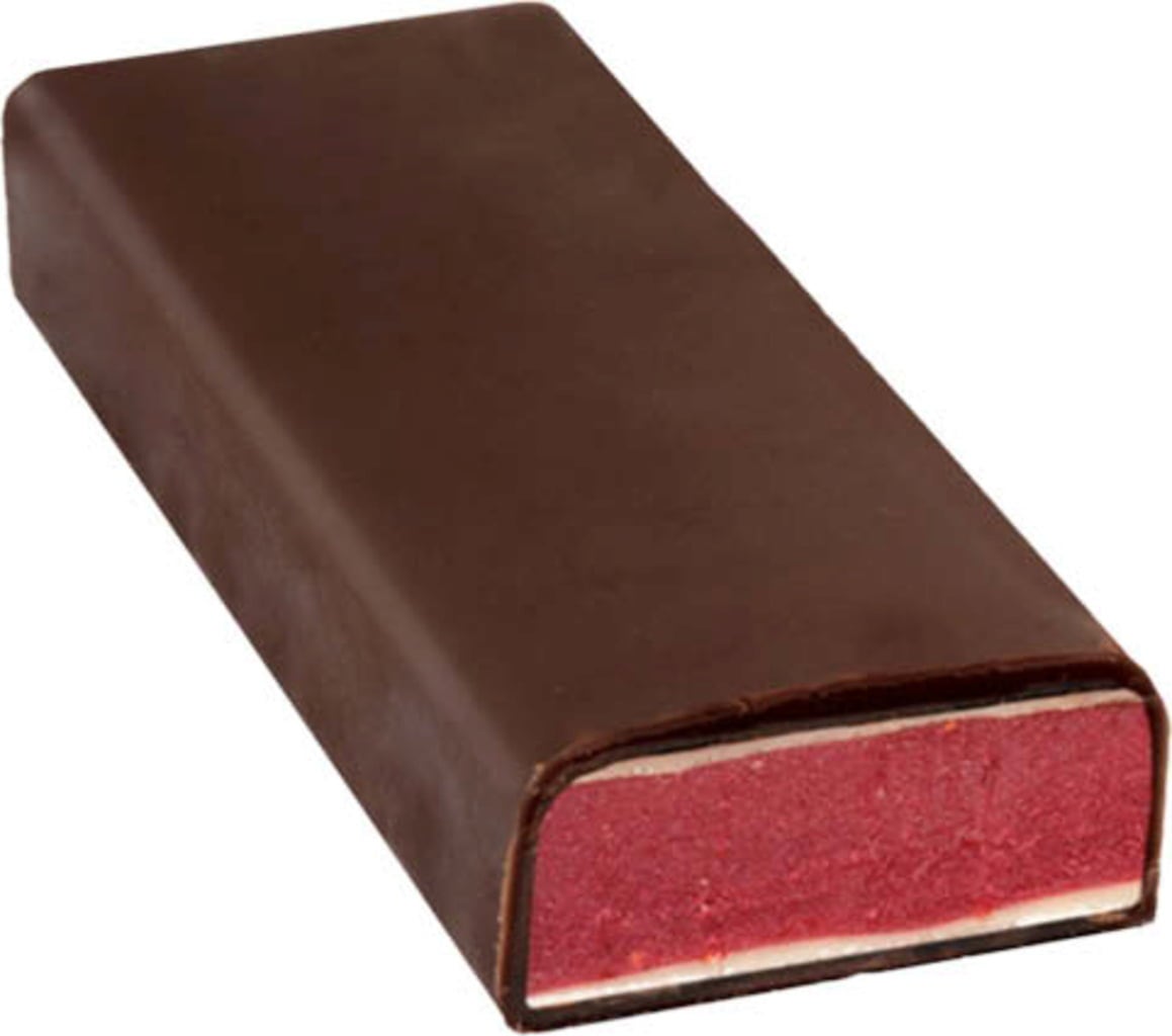 Binnenin zit een fruitige roze frambozenganache verborgen, waarvan de fascinerende authentieke bessensmaak en heldere kleur volledig natuurlijk zijn gemaakt door frambozen. De vulling is heel fruitig en verfrissend zuur - een perfecte balans met de zoetheid. De ganache is omhuld met een flinterdun laagje witte chocolade en krijgt dan een elegant laagje pure fijne chocolade met een cacaogehalte van 70%.
