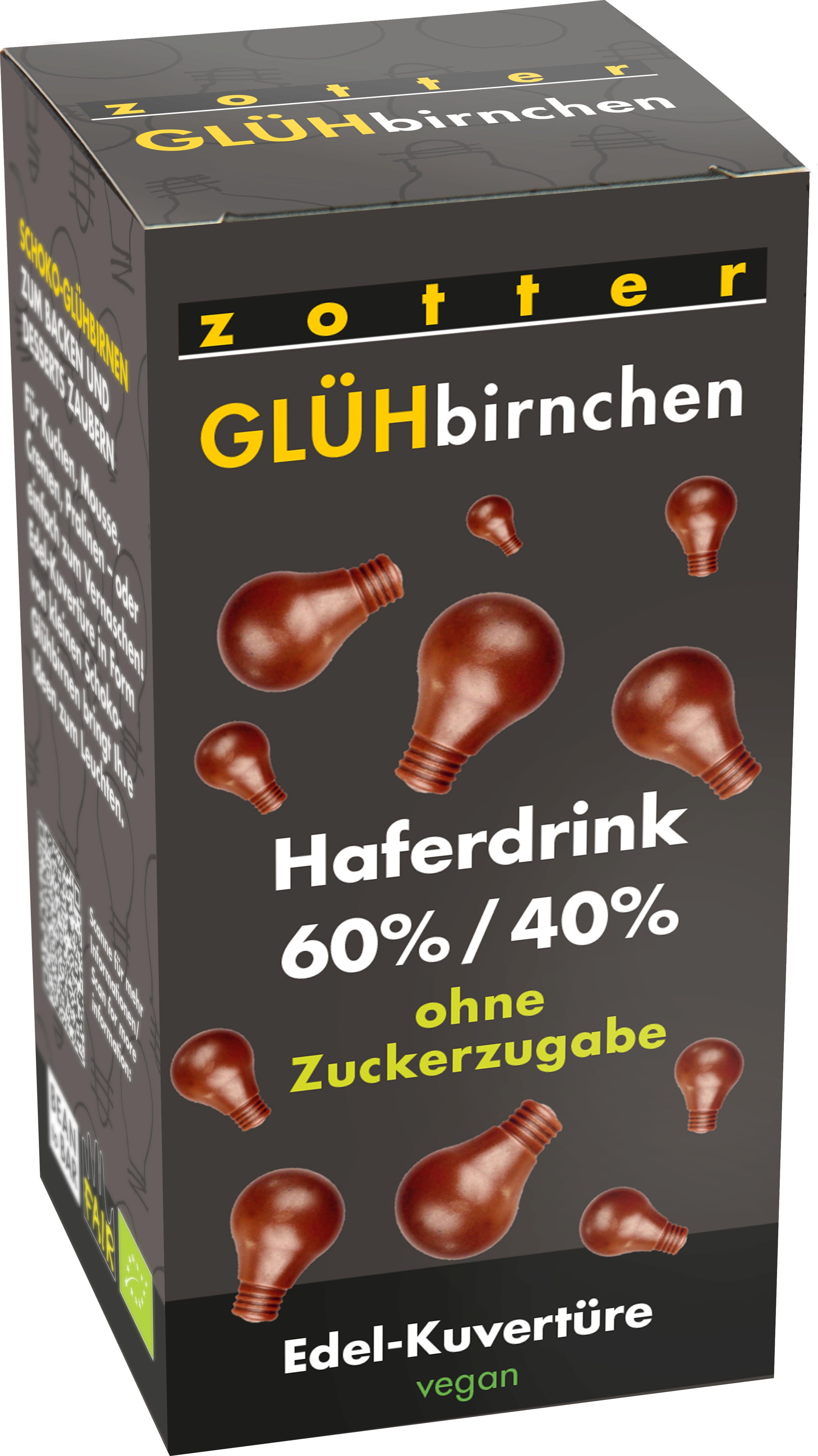 De gloeilampen zijn gemaakt met haverdrank in plaats van melk en zijn daarom een veganistisch alternatief voor de klassieke melkcouverture. Het hoge cacaogehalte van 60% maakt hem bijzonder chocoladeachtig. Er is geen toegevoegde suiker, maar de haverdrank zorgt voor een lichte zoetheid.